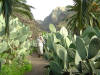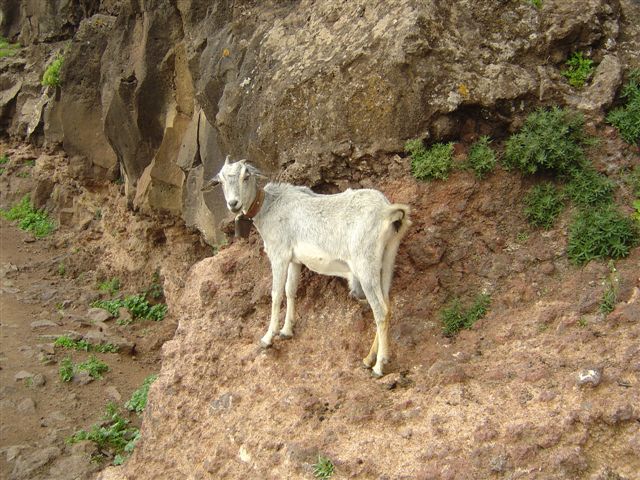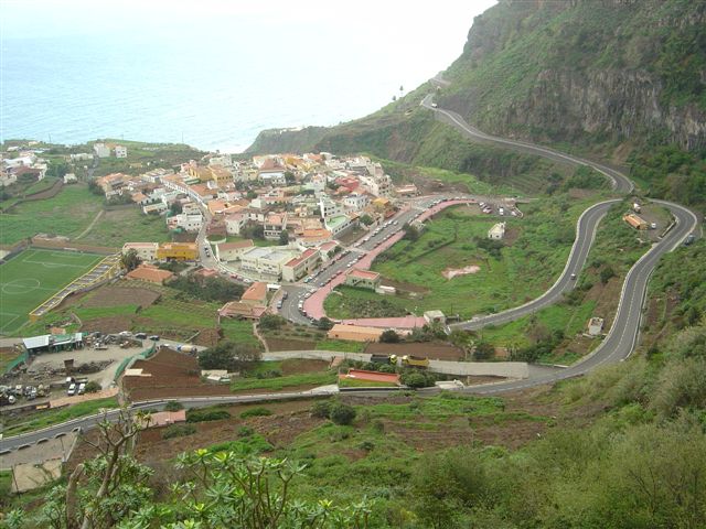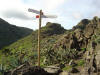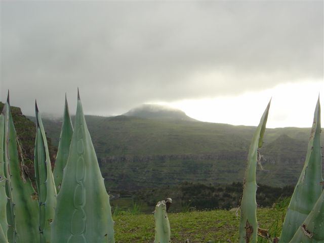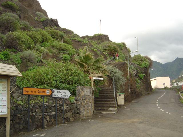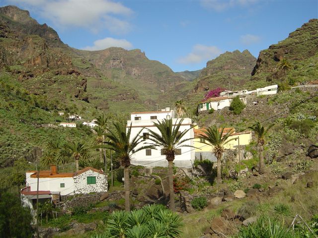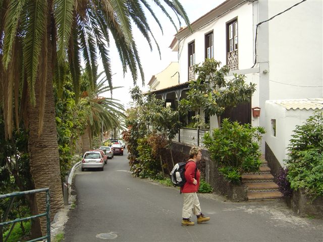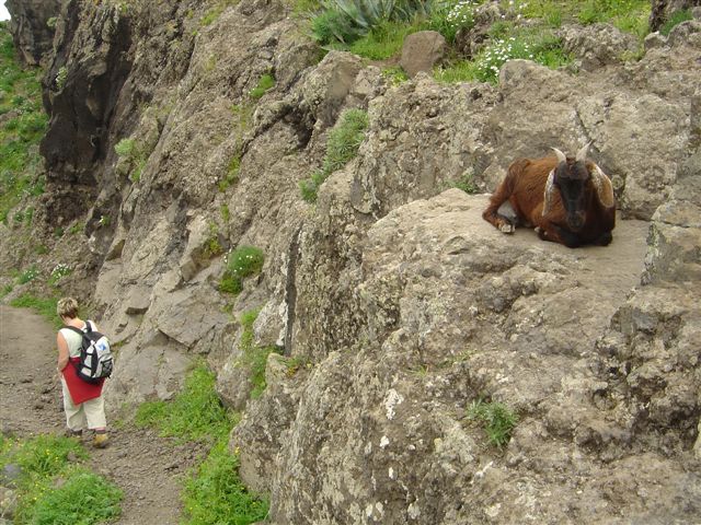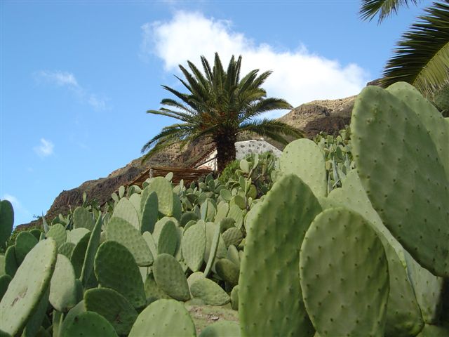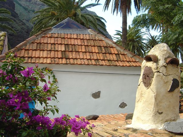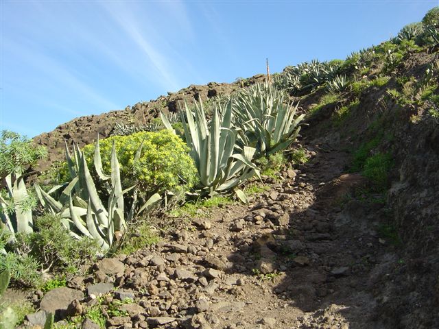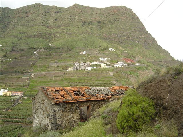 | Unsere heutige Anfahrt zum Startpunkt unserer Wanderung führt uns über Arure, Las Hayas, El Cercado und Chipude hinunter nach Santiago. Kurz nach Durchfahren des Tunnels von Santiago biegt links eine Stichstraße in den Barranco de Bechijigua ein. Dieser folgen wir ca. 4km bis zum Weiler Taco, wo wir unser Auto parken. Heute haben wir mit dem Wetter Glück, es ist angenehm sonnig und ideal zum Wandern bei 22°C. Die ersten Meter folgen wir der Straße nach Pastrana. Hier im Tal herrscht totale Ruhe und Stille. Nach dem hübschen Ort Pastrana führt unser Weg hinunter in den Barranco, wo wir mehrmals den Bach überqueren. Im Wanderführer wird hier vom ausgetrocknetem Bachbett gesprochen. Wir hingegen haben teilweise Mühe, trockenen Fußes auf die andere Seite zu gelangen. Inzwischen lugt auch der Roque Agando am oberen Ende des Barrancos hervor. Hier sehen wir ihn als unseren ständigen Begleiter von der mächtigen Südseite. Oft ist er in Wolken gehüllt, manchmal hingegen hat er seine weiße "Mütze" abgelegt. Nach einer reichlichen Stunde erreichen wir Lo del Gato (Katzenrücken). Das ist ein total verschlafenes Dorf, wo die Welt noch in Ordnung ist. Hier kommen wir mit einem alten Canario ins Gespräch, was teilweise in Spanisch, so gut es geht, meistens aber mit Händen und Füßen geführt wird. Aber wir haben uns verstanden...;-). Wanderer kommen hier wahrscheinlich nicht allzu oft vorbei. Die meisten wählen nur die Abstiegsroute vom Roque Agando nach Santiago, welche hier durchgeht; wir hingegen wollen durch das ziemlich weglose Gelände nach Pastrana und Taco zurück. Also kraxeln wir im Steilaufstieg durch Opuntien und Agaven weglos auf einen Kamm hinauf. Nachdem wir mehrmals uns neu orientieren müssen, wechseln wir in den Barranco de Guarimiar hinüber. Von hier ist es nicht mehr weit hinunter nach Taco, wo wir unser Auto stehen haben. Inzwischen sind auch hier einige Wolken aufgezogen, so dass wir nicht zum Baden fahren, sondern auf Balkonien relaxen. Abends gehen wir in unser Stammlokal, das "Abisinia" nach Vueltas. | |