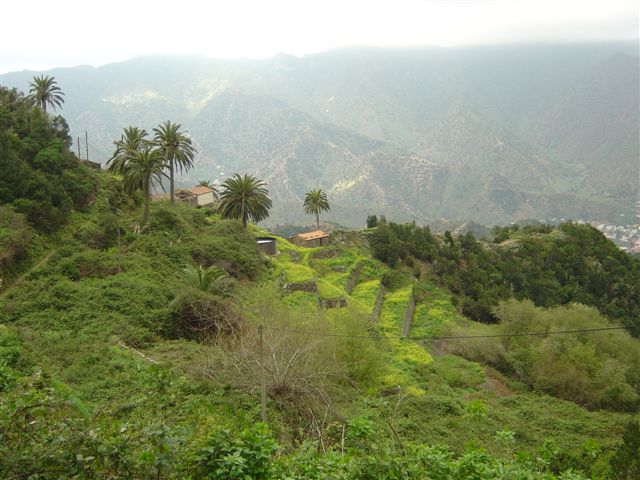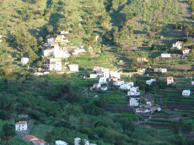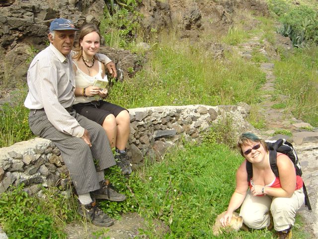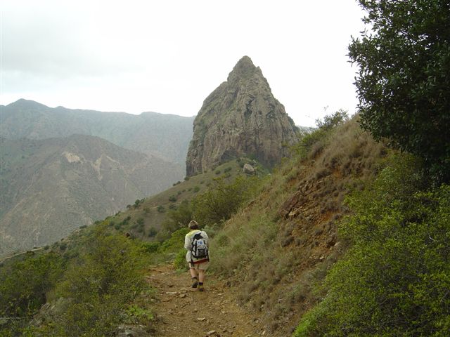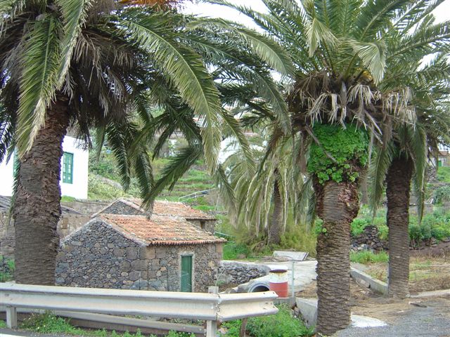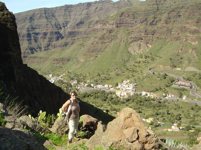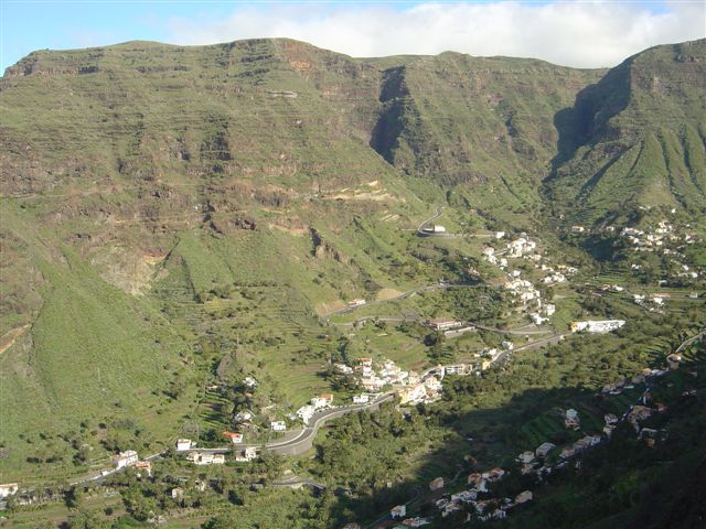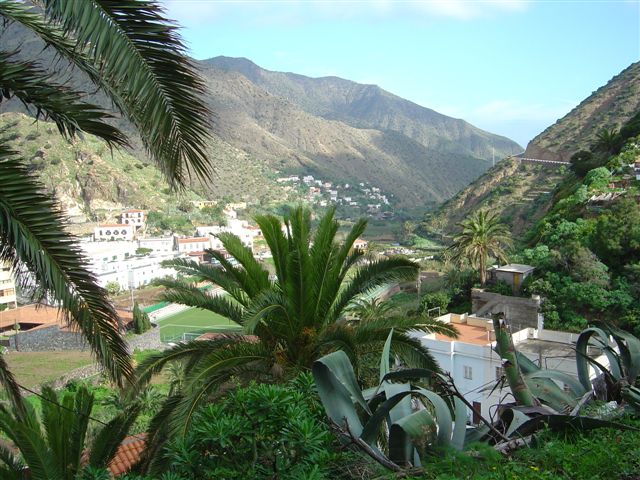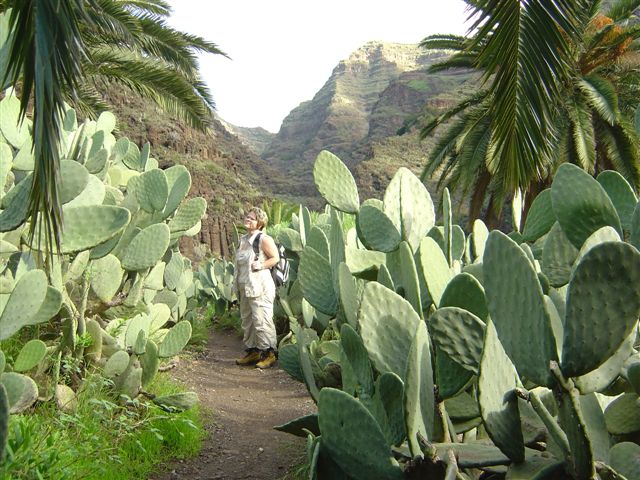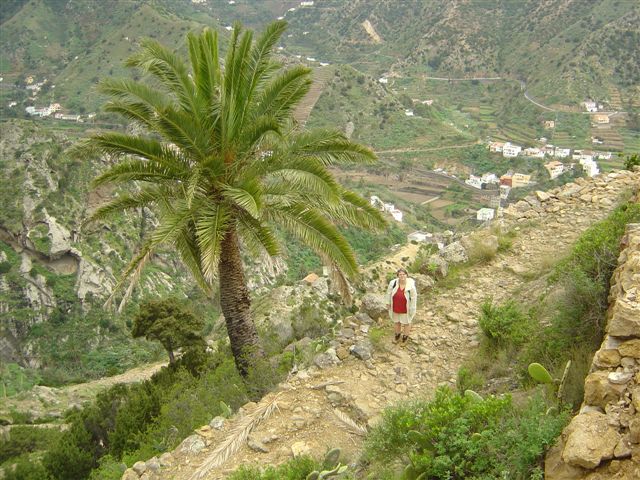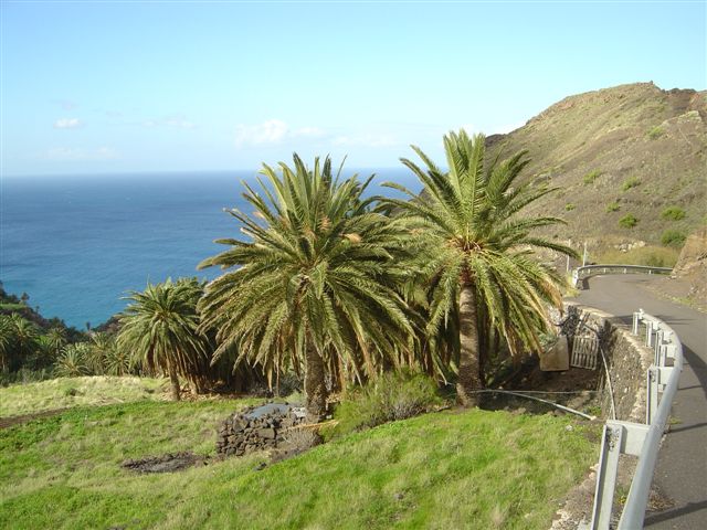 | Wie immer früh pünktlich starten wir Richtung Arure. Weiter fahren wir heute in Richtung Vallehermoso, wo unsere heutige Tour beginnt. Diese haben wir bereits im Sommer 2004 einmal absolviert und haben sie in guter Erinnerung. Wir parken an der Carretera del Norte unmittelbar an einem Kinderspielplatz. Hier führt eine anfangs asphaltierte Straße hinauf zum Ortsteil "Garabato", den wir dann schnell hinter uns lassen. Weiter oben im Tal wird viel Landwirtschaft betrieben und überall wächst Mais, Tomaten, Wein, Papayas, Mangos und Bananen. Weiter den Weg stehen nur noch ein paar einzelne Häuser von Eremiten. Nach ca. 45 Minuten erreichen wir unweit einer kleinen Staumauer ein kleines Trafohaus, wo unser Weg steil hinauf nach El Tion abbiegt. Dieser Anstieg zum kleinen Weiler ist zwar kurz aber ziemlich steil, so dass wir schon etwas ins schwitzen kommen. Während des Aufstiegs haben wir schon oben auf dem Rand des Barrancos das Restaurant "Roque Blanco" erspäht. Bevor wir dieses aber erreichen, müssen wir von El Tion noch die steile Piste hinauf wandern. Diese wird gerade von den Überresten von vielen Steinschlägen befreit, welche der Regen der letzten Tage verursacht hat. Das Restaurant besuchen wir dieses mal nicht. Die Lage ist phantastisch, auch die Küche ist lecker aber da öfters neben Einheimischen und Wanderern auch ganze Busladungen von Touris erwartet werden, können wir das Restaurant trotz guter Küche nur bedingt empfehlen. Kurz hinter dem "Roque Blanco" biegt der Weg hinüber zum Roque Cano ab. Von dieser Traverse hat man nochmals einen schönen Blick zurück auf unseren zurückgelegten Aufstiegsweg. Bald erreichen wir den Roque Cano, der wie auch der Roque Agando ein erkalteter Magmakern eines Vulkans ist. Nach Passage winden wir uns in vielen Serpentinen wieer hinunter nach Garabato und Vallehermoso zu unserem Auto. Von hier gehts zurück ins Valle, wo wir nach kurzem Zwischenstopp in der Dulceria La Namera nochmals an die Playa Argaga zum Baden fahren. Am Abend bummeln wir dann noch durch Vueltas. | |