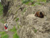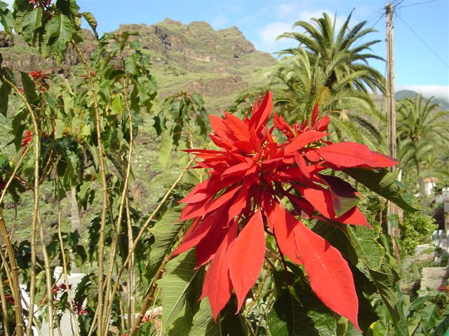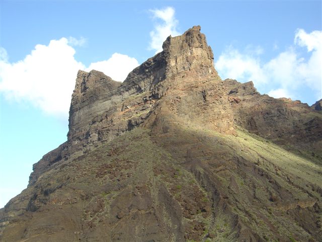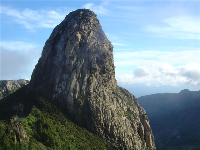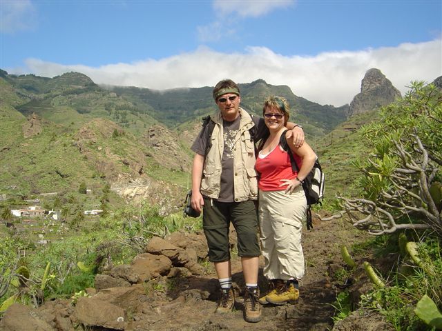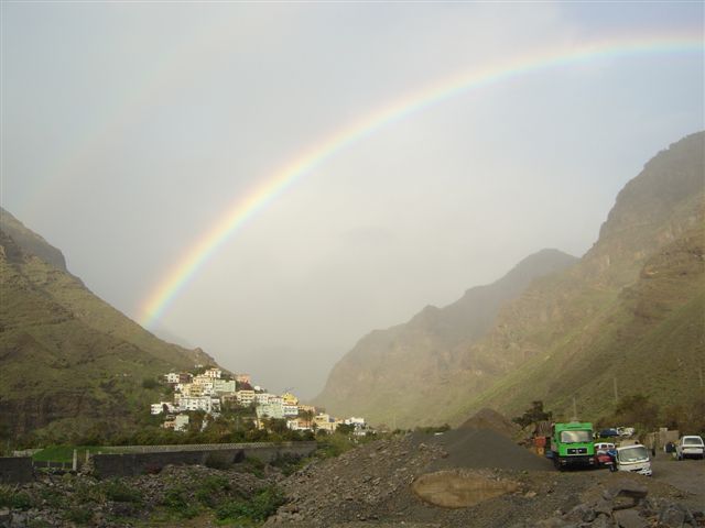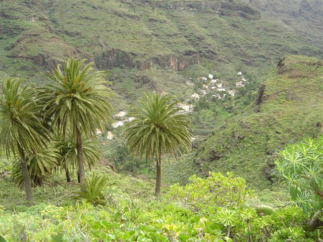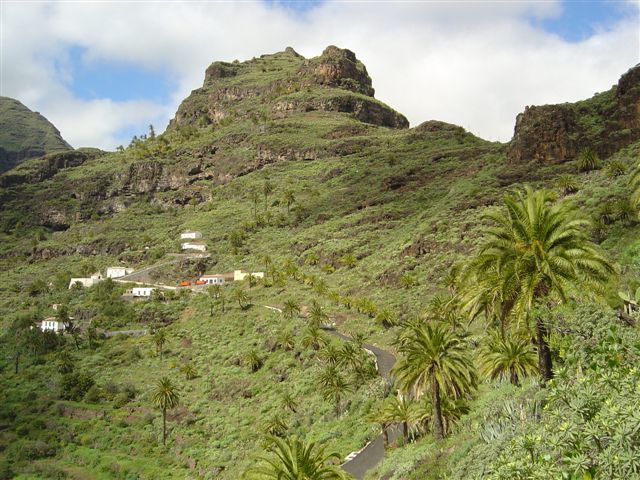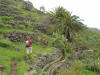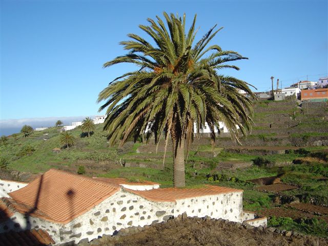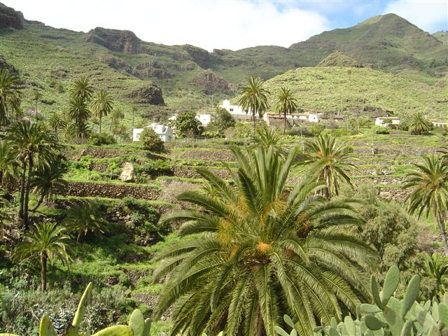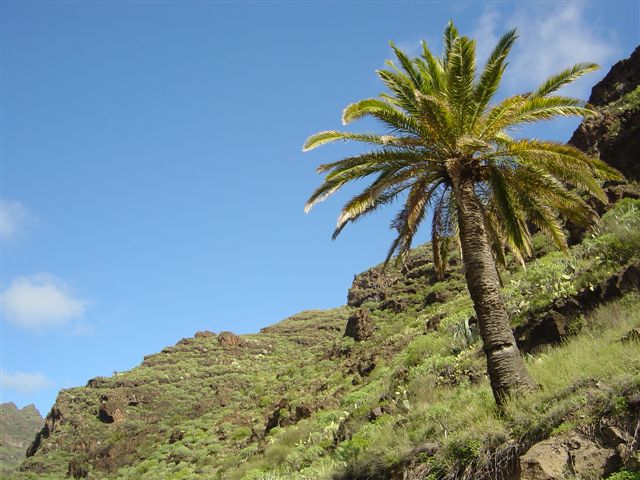 | Wie immer früh pünktlich starten wir Richtung Arure. Weiter fahren wir heute in Richtung Vallehermoso, wo unsere heutige Tour beginnt. Diese haben wir bereits im Sommer 2004 einmal absolviert und haben sie in guter Erinnerung. Wir parken an der Carretera del Norte unmittelbar an einem Kinderspielplatz. Hier führt eine anfangs asphaltierte Straße hinauf zum Ortsteil "Garabato", den wir dann schnell hinter uns lassen. Weiter oben im Tal wird viel Landwirtschaft betrieben und überall wächst Mais, Tomaten, Wein, Papayas, Mangos und Bananen. Weiter den Weg stehen nur noch ein paar einzelne Häuser von Eremiten. Nach ca. 45 Minuten erreichen wir unweit einer kleinen Staumauer ein kleines Trafohaus, wo unser Weg steil hinauf nach El Tion abbiegt. Dieser Anstieg zum kleinen Weiler ist zwar kurz aber ziemlich steil, so dass wir schon etwas ins schwitzen kommen. Während des Aufstiegs haben wir schon oben auf dem Rand des Barrancos das Restaurant "Roque Blanco" erspäht. Bevor wir dieses aber erreichen, müssen wir von El Tion noch die steile Piste hinauf wandern. Diese wird gerade von den Überresten von vielen Steinschlägen befreit, welche der Regen der letzten Tage verursacht hat. Das Restaurant besuchen wir dieses mal nicht. Die Lage ist phantastisch, auch die Küche ist lecker aber da öfters neben Einheimischen und Wanderern auch ganze Busladungen von Touris erwartet werden, können wir das Restaurant trotz guter Küche nur bedingt empfehlen. Kurz hinter dem "Roque Blanco" biegt der Weg hinüber zum Roque Cano ab. Von dieser Traverse hat man nochmals einen schönen Blick zurück auf unseren zurückgelegten Aufstiegsweg. Bald erreichen wir den Roque Cano, der wie auch der Roque Agando ein erkalteter Magmakern eines Vulkans ist. Nach Passage winden wir uns in vielen Serpentinen wieer hinunter nach Garabato und Vallehermoso zu unserem Auto. Von hier gehts zurück ins Valle, wo wir nach kurzem Zwischenstopp in der Dulceria La Namera nochmals an die Playa Argaga zum Baden fahren. Am Abend bummeln wir dann noch durch Vueltas. | |