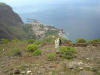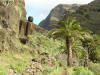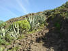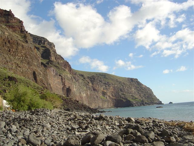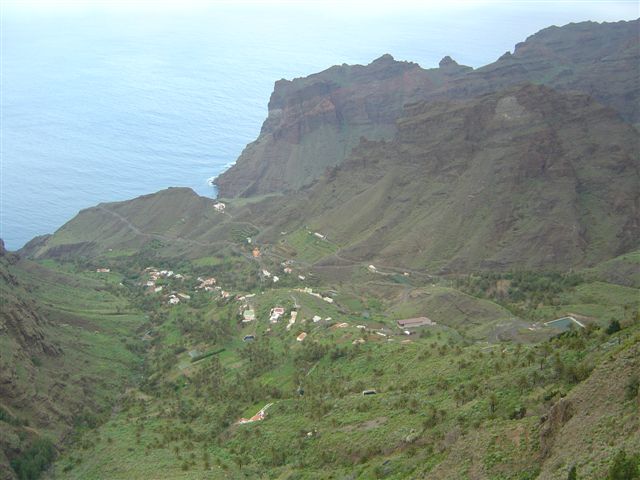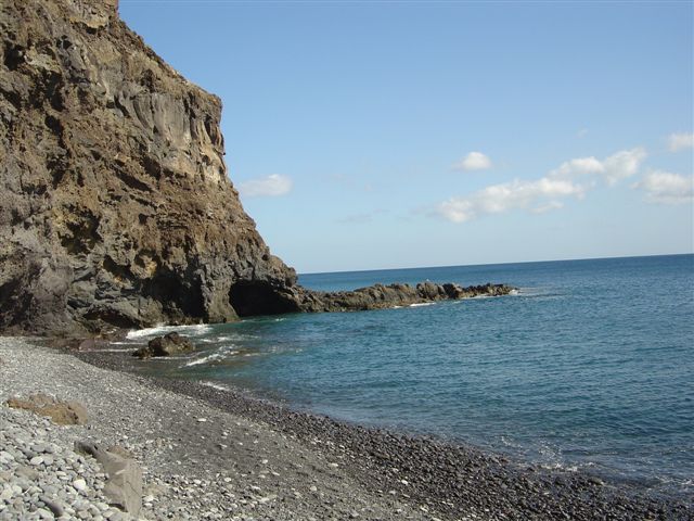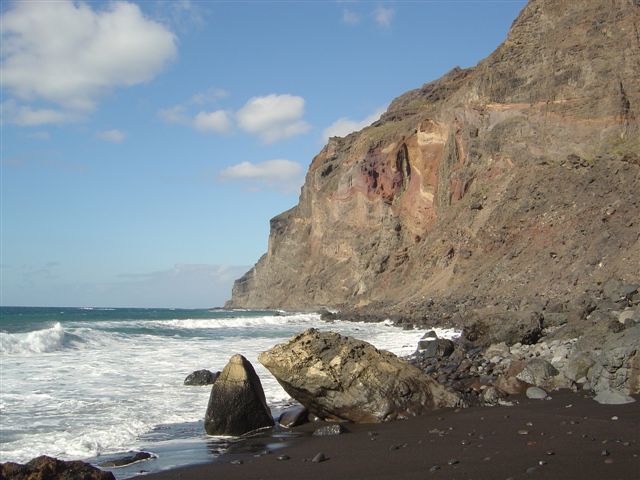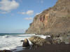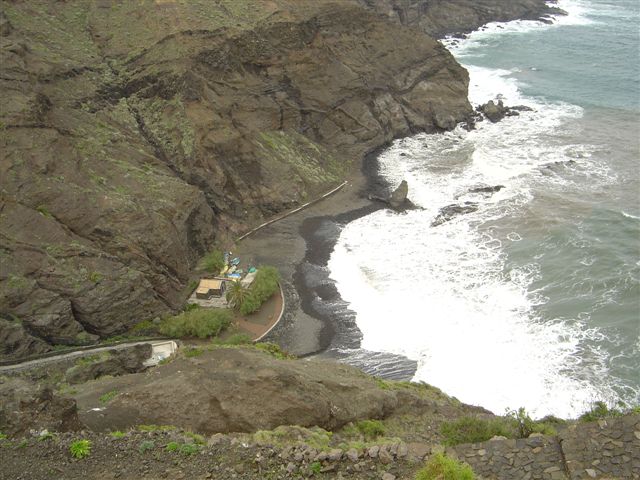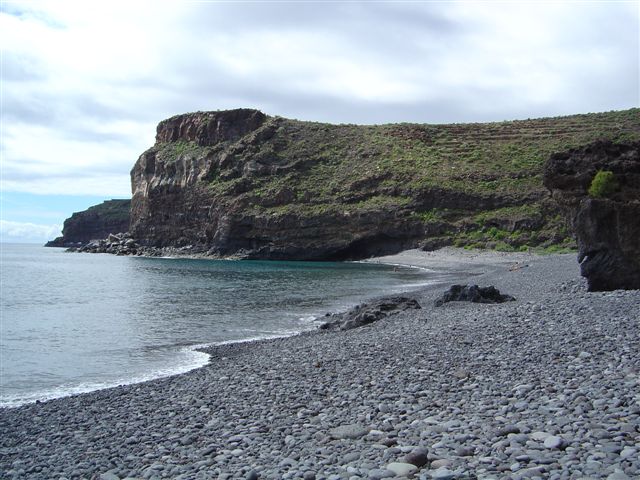 | Alos steigen wir vom Barranco recht steil auf einen kleinen Kamm auf. Hier oben beginnt ein Rundwanderweg zuerst Richtung Casas del Palmar und weiter zur Playa de la Caleta. Das erste Teilstück zieht sich auf einer breiten Piste entlang. Hier hat man ständig wieder den schneebedeckten Teide vor sich. Nach ca. 2 Stunden erreichen wir die Casas del Palmar, wobei der Ausdruck Casas wohl eher übertrieben ist. Dahinter verstecken sich 3 kleinere kanarische Steinhäuser und mehrere Ziegengatter - das wars. Von dort zieht sich der Weg über eine Hochebene hinunter zur Playa. Bevor sich der Blick zum Strand bietet, mündet unser Weg in einen Barranco, von wo man auch gute Ausblicke hinunter zur Küste hat. Dann bald sehen wir die schwarzsandige Playa de la Caleta unter uns liegen. Da es heute eh sehr bewölkt ist und auch ein recht hoher Wellengang vorherrscht, gehen wir nicht direkt hinunter um zu Baden, sondern wählen den direkten Wiederaufstieg zur Kammhöhe, um von dort abermals hinunter nach Hermigua abzusteigen. Nach Knapp 4 Stunden sind wir wieder am Auto zurück. | |