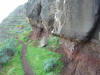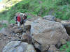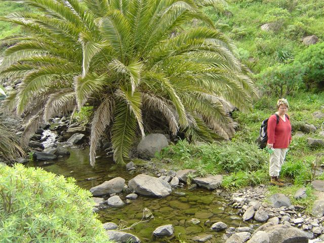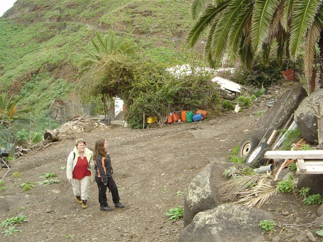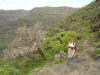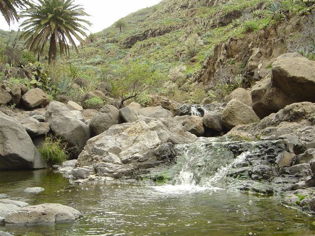 | Traditionsgemäß steht immer am ersten Tag die Wanderung zum Salto de Agua auf dem Programm. Gegen 09:00 Uhr starten wir (ohne Jenny, die sich erstmal in Vueltas umschauen will). Nach einer knappen halben Stunde erreichen wir El Guro, ein herrliches kleines Künstlerdorf, welches fest in deutscher Hand ist. Fast alle Bewohner hier stammen aus Alemania. Die Wanderung ist an sich recht einfach, nur braucht man unbedingt etwas Orientierungssinn. Auch dieses Mal erwischen wir mehrmals kurz den falschen Pfad, zumal der eigentliche Weg durch das Bachbett wegen des vielen Wassers nicht gangbar ist, und wir uns so Weg-Alternativen suchen müssen. Bald schaffen wir es dann doch und stehen vor dem kleinen Wasserfall am Ende des Barranco. Zurück nehmen wir den gleichen Weg. | |