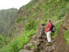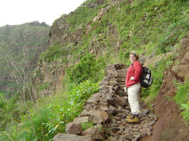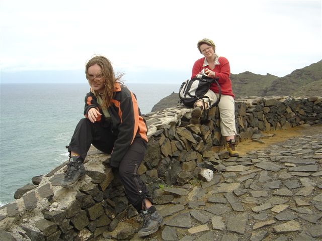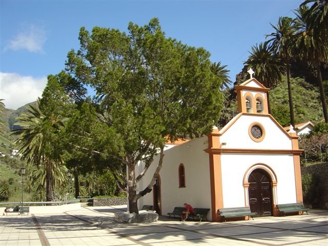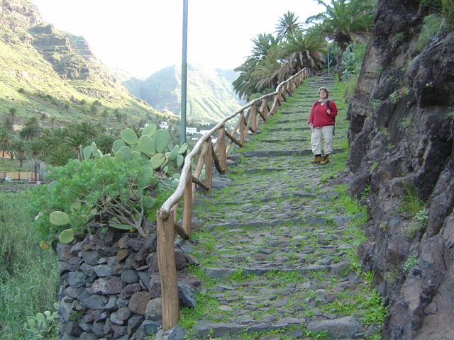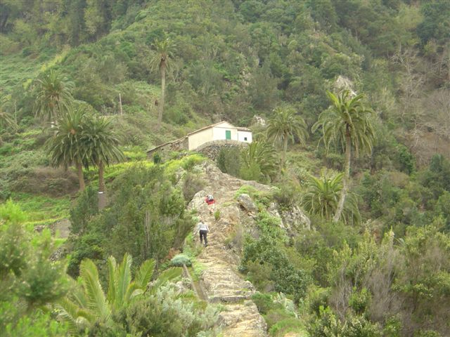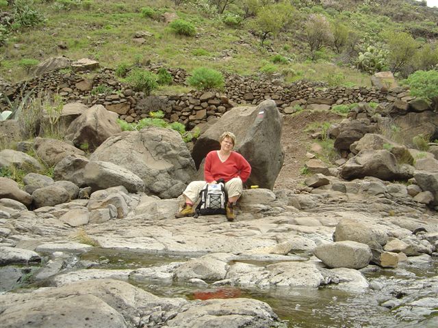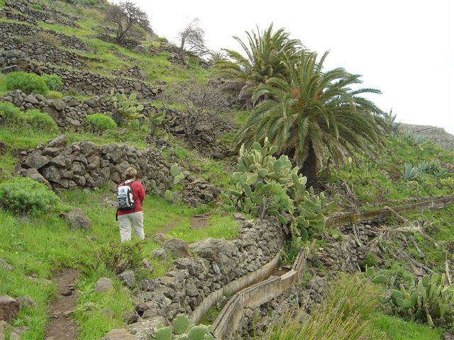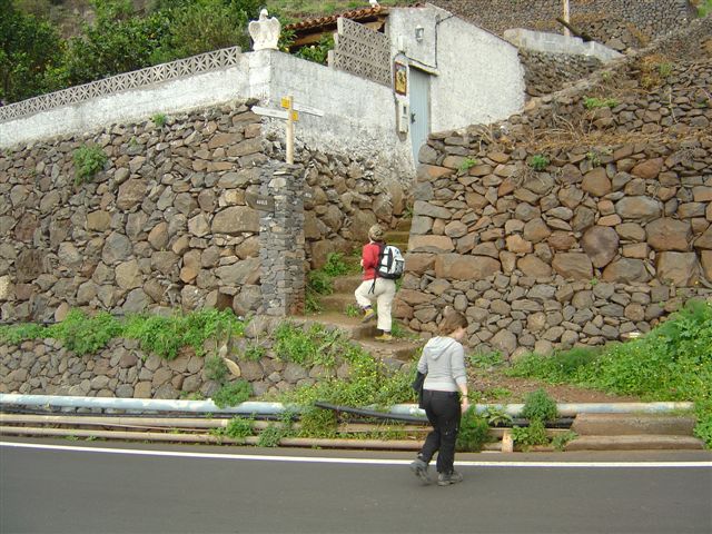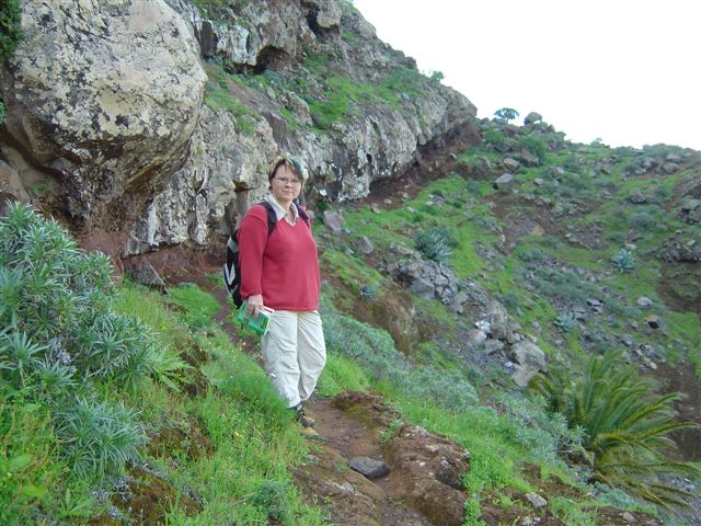 | Auch heute sind wir wieder auf den Bus angewiesen. Also wieder zeitig aufstehen. Der gleiche Bus wie gestern bringt uns hinauf nach El Cercado, wo wunderbar die Sonne scheint, auch wenn es nur ca. 9°C sind. Am Restaurant "Victoria" beginnt unsere Wanderung, die am Beginn durch alte, nur noch teilweise bewirtschaftete, Felder führt. Teilweise ist kein Weg zu erkenn und man muss seine pfadfinderischen Kenntnisse zum Einsatz bringen. Schon bald ändert sich das und der Weg ist wieder klar und deutlich zu finden. Ab der Alm La Mantanza trübt es sich leider ein und die Sonne versteckt sich hinter den Wolken. Kurz nach der Alm queren wir den Barranco de Argaga (...hier mündet auch der Alternativweg von Chipude ein) und laufen nun in einem alten Wasserkanal. Der ist schon recht verfallen und wir müssen immer wieder seitlich ausweichen. Im Bachlauf ist in diesem Winter viel Wasser. Bei unserer letzten Wanderung hier im Sommer 2004 war alles ausgetrocknet. Nachdem der kleine Emita de Guadeloupe ins Blickfeld kommt, biegt unser Weg scharf rechts nach unten zum Bachbett ab. Unten angekommen nehmen wir erst einmal ein erfrischendes Bad in einer Gumpe. Die Wassertemperatur sollte kaum mehr als 10°C betragen, also nur etwas für saunaerfahrene Wanderer wie wir. Nach dem Bad steigen wir eineige Höhenmeter zur Kammscharte Degollada del Cerrillal hinauf. Hier beginnt wieder der Kirchenpfad, welchen wir dieses mal abwärts bewältigen. Bald stehen wir wieder unten an der Ermita de los Reyes, queren den Barranco de Valle Gran Rey und laufen zurück hinunter an die Küste. Nach kurzem Entspannen im "La Olas" in La Playa gehts zum Duschen ins Quartier. Nachdem es inzwischen unten im Valle wieder sonnig geworden ist, besuchen wir am Abend die Tambara-Bar, um hier bei Caipirinha und Weißbier einen herrlichen Sundowner zu erleben. | |