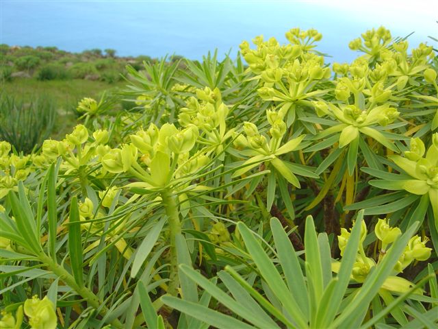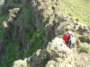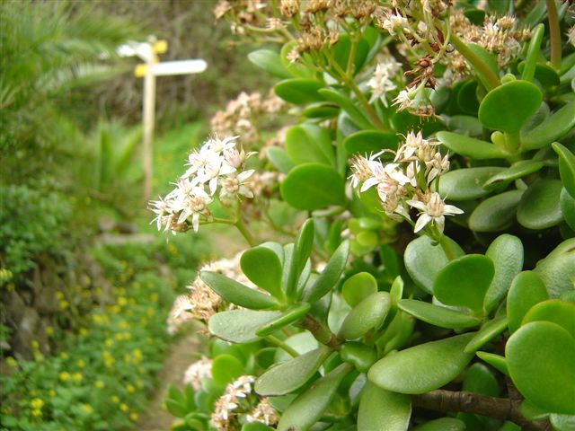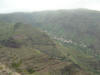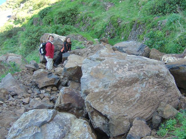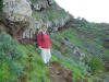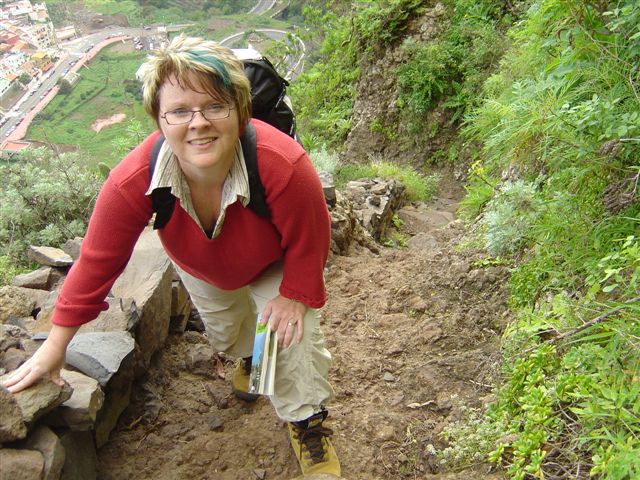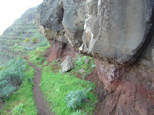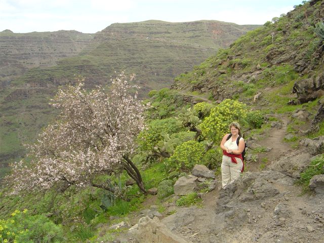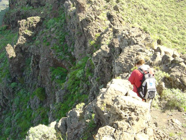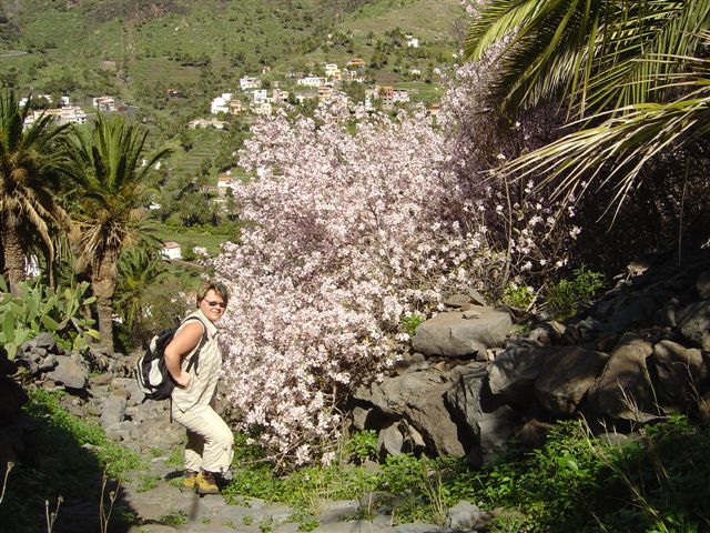 | Jenny hat beschlossen, heute mal auszuschlafen. So machen wir zwei uns früh auf den Weg hinauf Richtung El Guro. Unsere heutige Tour zum Roten Schichtband beginnt hier. Also durchqueren wir den Barranco und steigen die paar Meter hinauf zur kleinen Ermita de los Reyes. Kurz hinter der Ermita beginnt der steile, schweißstreibende Aufstieg auf dem Kirchenpfad. Trotzdem, dass der Aufstieg konditionell sicher anspruchsvoller ist, läßt es sich in dieser Richtung besser gehen, als abwärts, was wir in den nächsten Tagen noch erfahren werden. Nach 1/4-Stunde sind wir dann oben an der Kammscharte Degollada del Cerrillal (700 m.ü.M.) angelangt. Hier oben hat man den ultimativen Blick ins Valle und zur anderen Seite in den Barranco de Argaga. Nach kurzer Orientierung finden wir den Einstieg zum Roten Schichtband. Man kann kaum einen Weg erkennen. Der Pfad führt direkt an der Felswand entlang und für nicht schwindelfreie können wir diese Strecke nicht empfehlen. Ebenso sollte man nach Regenfälle auf diesen Weg besser verzichten. Eine knappe halbe Stunde führt wandern wir über diesen Balkon des Valle. Die Gegenseite von La Merica ist während unseres gesamten Weges voll von der Sonne angestrahlt, während wir selbst noch im Schatten unterwegs sind. Dann führt der Weg zuerst in Serpentinen, später jedoch in einer Gesteinsrille steil hinunter. Hier müssen wir dann öfters auch die Hände zu Hilfe nehmen und dieses Teilstück ist schon eher ein Klettersteig als ein Wanderweg. Unten sind schon die Häuser von La Viscaina zu erkennen. Unten angekommen schlendern wir durch eine Unmenge blühender Mandelbäume hinüber zum Ortsteil El Hornillo und weiter zurück zur Ermita de los Reyes. Zurück im Valle fahren wir noch mal schnell zur Playa Argaga, um kurz in den Atlantik zu springen. Nach einem Duschstopp im Quartier nehmen wir dann noch in der Tambara-Bar einen Sundowner. | |