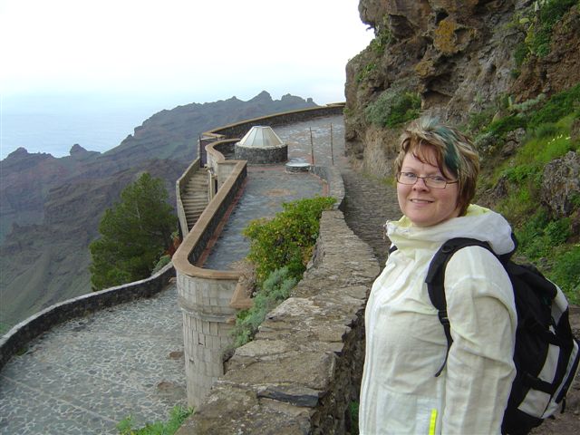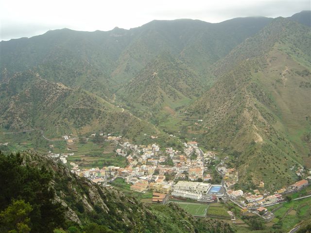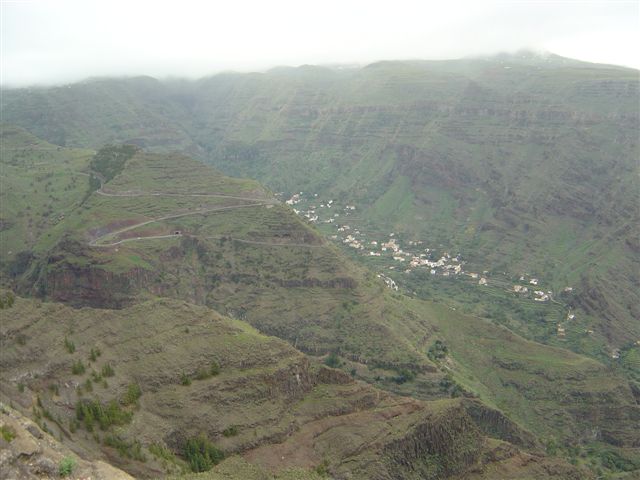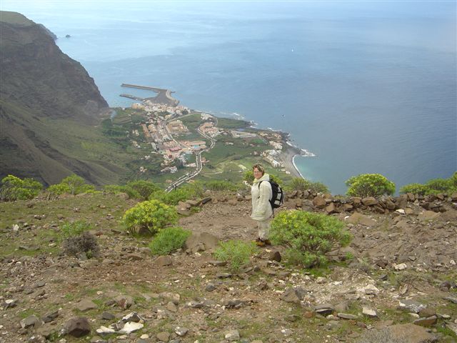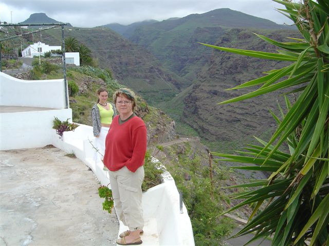 | Heute klingelt unser Wecker bereits vor 07:00 Uhr. Das liegt daran, dass im Valle nur wenige Busse fahren und der einzige, welche sinnvoll für Wanderer ist, fährt bereits um 08:00 Uhr los. Dieser Bus ist dann auch übervoll besetzt und bringt uns in ca. 45. min. Fahrt hinauf nach Arure. Hier steigen wir am Restaurant "El Jape" aus und laufen zuerst hinüber zur anderen Seite, um den Mirador El Santo zu besuchen. Von hier aus hat man einen phantastischen Blick hinunter nach Taguluche und die Galionsberge. Bei guten Wetter ist auch La Palma und El Hierro von hier zu sehen. Heute kann man nur schemenhaft Konturen der beiden Nachbarinseln entdecken. Wir laufen weiter den Weg Richtung Hochebene La Merica und sehen aus Richtung El Cercado dicke Regenwolken aufziehen. Auf der anderen Talseite schüttet es recht heftig, während wir im Trockenen wandern. Nach Passage der Hochebene kommen wir an die vordere Abbruchkante und wir haben den Blick frei hinunter in das gesamte Valle Gran Rey. Von Vueltas bis fast zur Playa del Inglés liegt das komplette VGR wie auf einer Modelleisenbahn vor uns. Von hier aus schlängeln sich viele Serpentinen die ca. 850 Hm hinunter. Glücklicherweise hält das Wetter und wir kommen trocken unten in La Calera an. Da es inzwischen fast Mittag ist, nehmen wir ein kleines Häppchen (Filte de Atun) an der Playa, um dann weiter zum Sonnen an die heute windige Playa del Inglés zu laufen. Hier treffen wir auch Jenny, die heute nicht mit auf Tour war. | |
