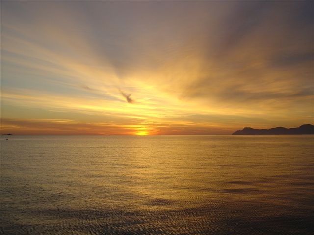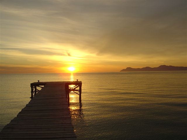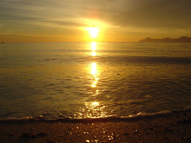 | Heute früh haben wir uns den Wecker schon recht zeitig gestellt. Außer der Tatsache, dass wir zwangsläufig unsere Koffer packen müssen, steht ein morgendlicher Strandspazierung zum Sonnenaufgang auf dem Plan. So stehen wir also schon wenige Minuten nach 07:00 Uhr an der Platja de Muro und erleben wie sich die Sonne langsam aus dem Meer erhebt. Die ganze Bucht wird in ein rotes bzw. goldgelbes Licht getaucht. | |