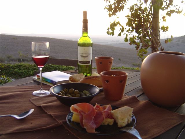 | Pünktlich um 16:15 Uhr startet unser Air-Berlin-Flieger von Nürnberg aus in Richtung Malaga. Hier erfolgt ein kurzer Zwischenstopp und nach ca. 45 Minuten geht's wieder zurück in den Flieger und weiter nach Jerez de la Frontera, wo wir, ebenfalls auf die Minute pünktlich, um 20:25 Uhr landen. Der Aeropuerto ist recht überschaubar, so dass wir binnen weniger Minuten unser Gepäck bekommen und auf sofort unseren Mietwagen übernehmen. So starten wir alsbald in Richtung Vejer de la Frontera. Über die N-IV und die nagelneue Autovia treffen wir (Dank guter Wegbeschreibung) nach ca. 1 Stunde Fahrt in unserem Quartier, der Casa Blanca de la Luz ein. Nach einer kurzen Erfrischung und einen ersten Schluck Sherry ist dann auch der erste Tag schon vorbei. | ||