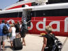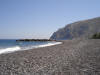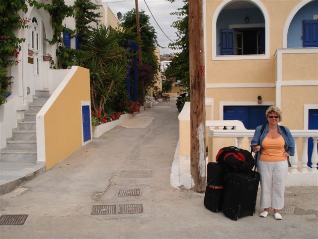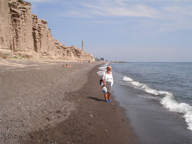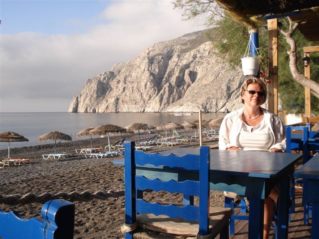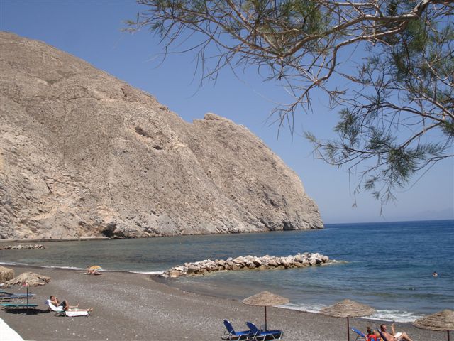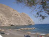 | Nachdem wir pünktlich am Nürnberger Flughafen eingetroffen sind, startet unser Air Berlin Flieger mit etwas Verspätung in Richtung Süden. Gegen 12:45 Uhr landen wir dann auf dem Flughafen von Santorin. Schon beim Landeanflug überqueren wir die Caldera, um dann in einer heftigen Kurve über Kamari den Flughafen anzusteuern. Ein Bus bringt uns die wenigen Meter hinüber nach Kamari, wo wir im "Hotel Makis" unterkommen. Dieses "Hotel" hat eher den Charme einer Jugendherberge. Nach zweimaligen Umziehen finden wir dann ein halbwegs akzeptables Zimmer, wenngleich wir auch hier Grund zur Beschwerde haben. Aber wir lassen uns dadurch nicht die gute Laune verderben und steuern erstmal den Strand von Kamari an, um uns im Wasser zu erfrischen. Nach einem Kurzstopp in unserer Unterkunft gehen wir noch im "Seaside" zum Abendessen und checken für morgen noch einen Mietwagen. | |