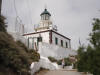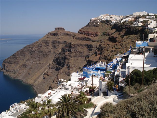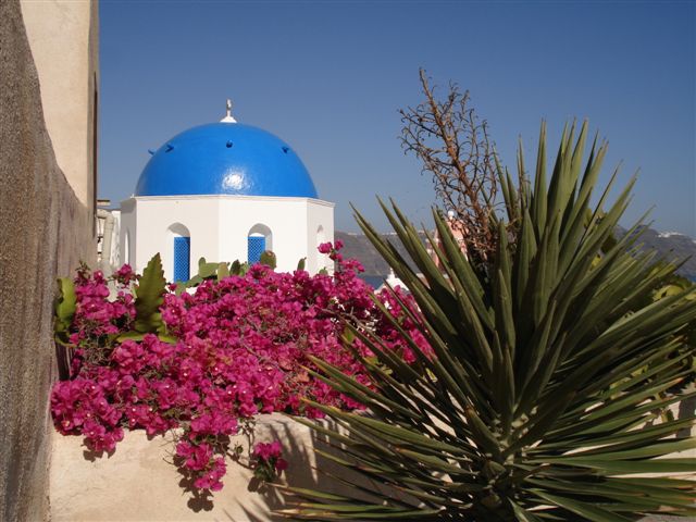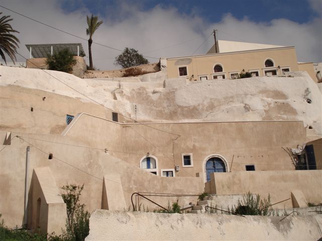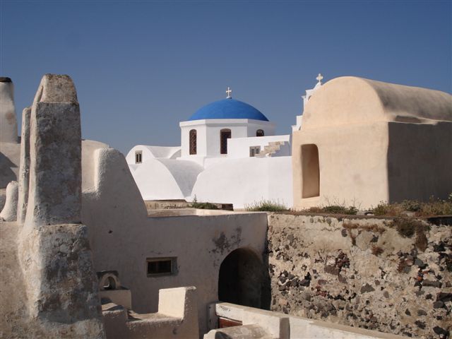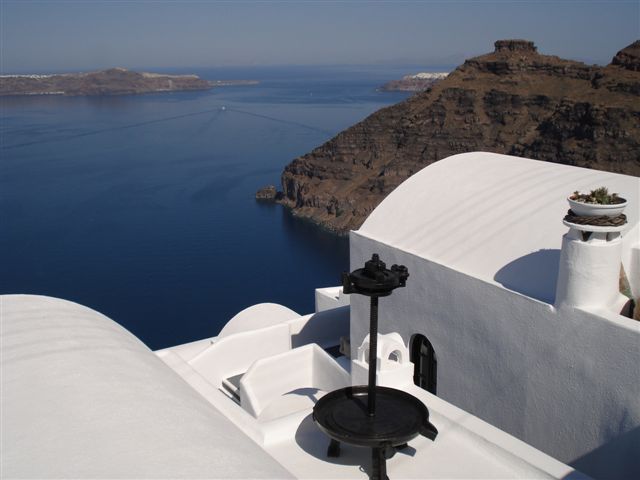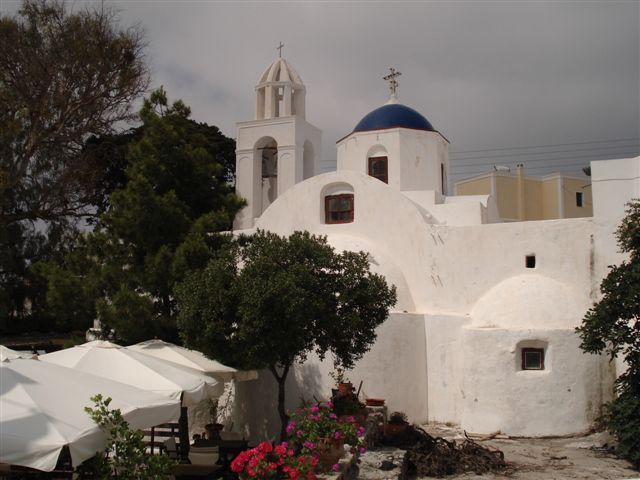 | Unser Mietwagen bringt uns heute früh zuerst nach Vothonas. Der Ort liegt inmitten eines Erosionstales unterhalb von Messaria. Die Häuser des Ortes sind mehrheitlich Höhlenwohnungen. Selbst einige Kirchen sind hier in den Fels gehauen. Da heute Pfingsten und in der Hauptkirche des Ortes außerdem Kirchweihfest ist, trifft man das ganze Dorf auf dem kleinen Kirchplatz. Nach der Runde durch den Ort fahren wir weiter nach Megalochori. Das bedeudet so viel wie "großes Dorf", was es nun wahrlich nicht ist. Eher klein aber vielleicht gerade deshalb sehr sehenswert. Hierher kommen nur wenige Touristen und alles wirkt noch authentischer als anderswo auf der Insel. Nach unserer Runde durch den Ort fahren wir weiter in den Süden der Insel zum Leuchtturm bei Akrotiri. Nach diesem Abstecher zieht es uns an den Strand nach Vlichada. Nachdem auch heute früh einige Wolken zu sehen waren haben wir nunmehr bestes Badewetter. An unserem letzten Tag lassen wir noch einmal die Seele baumeln. Im Anschluß fahren wir nochmals in die Inselhauptstadt, wo wir in Firostefani parken und die Kraterrandgasse hinüber nach Fira gehen. Heute Nachmittag ist es sehr ruhig, da nur ein kleines Kreuzfahrtschiff in der Caldera vor Anker liegt. Nach einer letzten Runde durch die Gassen von Fira und einen finalen Gyros-Pita fahren wir nach Kamari zurück. Hier speisen wir lecker in der BBQ-Corner und nehmen noch einen Sundowner in einer Bar unmittelbar am Meer. | |