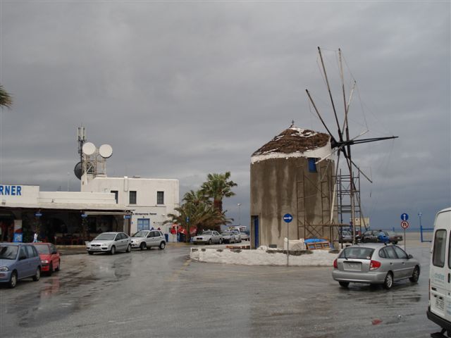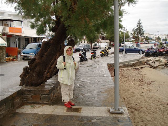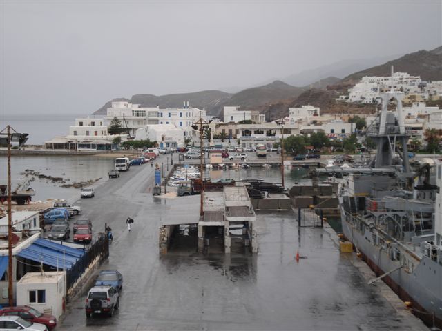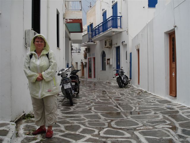 | Heute Nacht werden wir schon vom Regen geweckt. Am Morgen ist draußen alles grau in grau und es schüttet. Nach dem letzten Frühstück werden wir von einem Uralt-Bus (...der hat sicher die 60-ziger Jahre schon erlebt) abgeholt. Im Regen stehen wir am Fährhafen und warten auf unsere Fähre. Diese Kommt auch pünktlich und bringt uns in einer knappen Stunde hinüber nach Paros. Als wir Paros erreichen hat der Regen etwas nachgelassen und so bringt uns ein Bus die wenigen Meter ins Hotel Paros, direkt an der Bucht von Paros gelegen. So sind wir schon in unserem Hotel mit Blick auf die Bucht, während unsere Fähre noch im Hafen liegt. Im Regen drehen wir eine erste Erkundungsrunde durch Parikia. Auch hier erleben wir eine historische Altstadt mit viel Flair. Als wir im Quartier zurück sind nutzen wir die vorhandene Klimaanlage, um unsere Sachen zu trocknen. Dann geht förmlich ein Unwetter nieder, welches mich auf meinem Versorgungsgang zum benachbarten Supermarkt erwischt. Und schon wieder bin ich "durch, bis auf die Haut". Also muss die Klimaanlage wieder herhalten. Am Abend schaffen wir es gerade noch in die Hoteltaverne zum Abendessen. Danach zieht sich der Himmel wieder auf und teilweise sehen wir sogar blauen Himmel, so dass wir noch einen Abendbummel durch Parikia unternehmen. | |