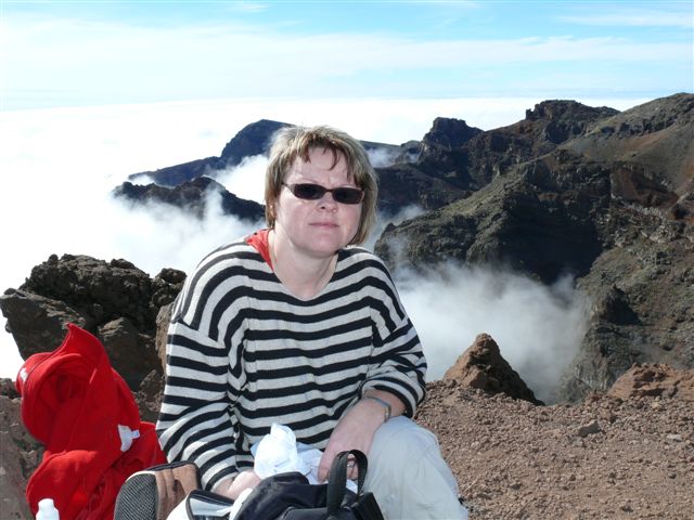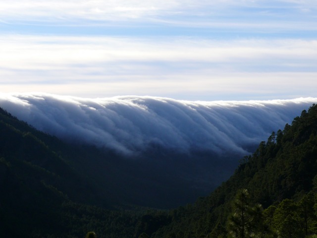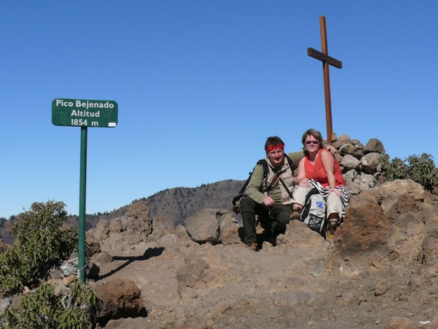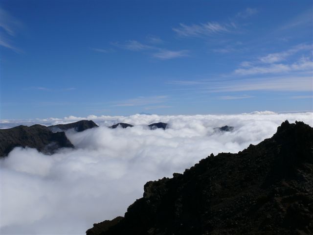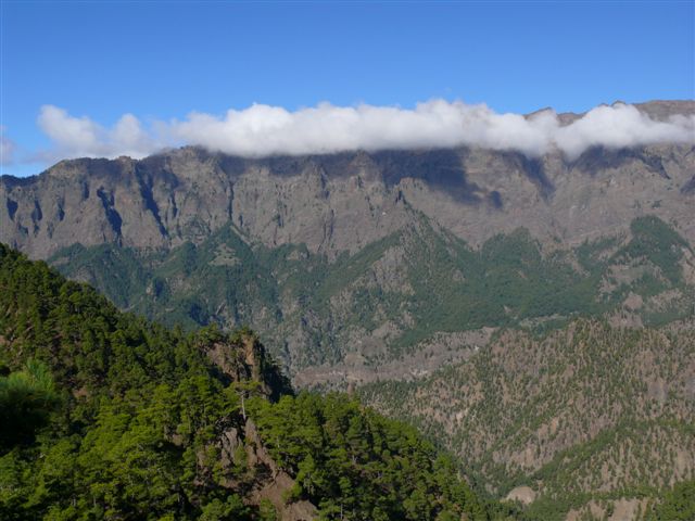 | Glücklicherweise geht es allen wieder gut, so dass der Wanderurlaub de facto heute beginnen kann. Anders als in den letzten Tagen ist heute der Pico Bejenado ohne Wolken, so dass wir uns spontan zum Aufstieg auf diesen Panoramagipfel entschließen. Wir fahren in El Paso vorbei am Centro de Visitantes in Richtung Valencia und treiben unseren Mietwagen einige Kilometer über eine ruppige Piste. Dann parken wir und starten den Steilaufstieg hinauf zum Bejenado. Nachdem wir die Diretissima bewältigt haben, geht es etwas ebener weiter und es bieten sich immer iweder phantastische Blicke hinunter in die Caldera bzw. hinüber zum Roque de los Muchachos. Nach 2 Stunden ist der Gipfel erreicht und wir tragen uns hier ins Gipfelbuch ein. Vis a vis auf Teneriffa sehen wir den Teide, welcher sich durch die Wolkendecke schiebt. Von hier oben hat man auch einen spektakulären Blick auf den Wolkenwasserfall, welcher heute an der Cumbre anliegt. Die Passatwolken werden förmlich herübergezogen und der Fön und die Sonne "fressen" die Wolken auf, sobald sie über den Kamm herübergekommen sind. Fast auf den gleichen Weg steigen wir wieder hinab zum Auto und lassen den Tag am Charco Verde ausklingen. Abends testen wir auf Empfehlung die Tasca Catalina und erleben ein wirklich tolles Abendessen in stimmungsvollem Ambiente. | |||