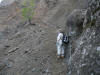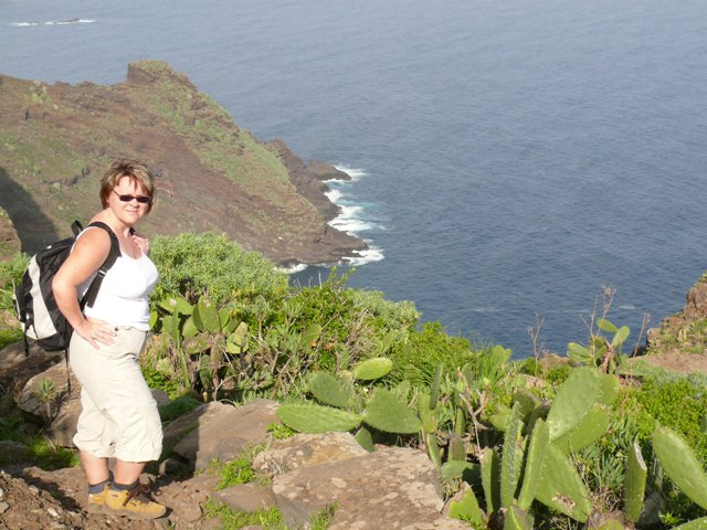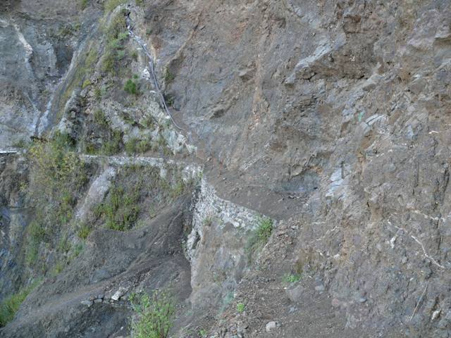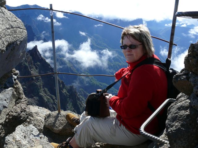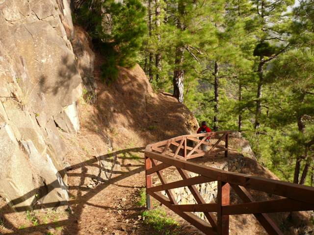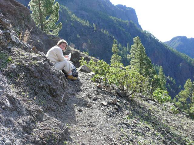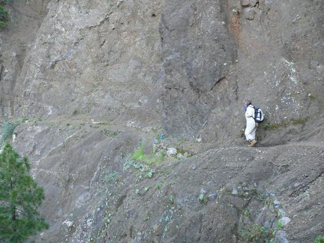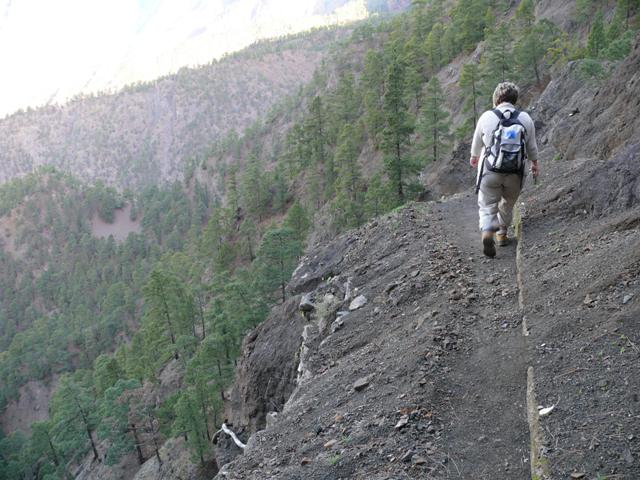 | Auch heute ist wieder tolles Wetter. Nach dem Outdoorfrühstück fahren wir hinauf zur Cumbrecita. Zuvor haben wir uns im Centro de Visitantes kurz nach zum Zustand des Weges zu unserem heutigen Ziel, dem Escuchadero, erkundigt. Hier meinte man; "The way is open, but it's very dangerous...". Trotzdem machen wir uns auf den Weg und haben so früh am Morgen noch kein Problem, an der Cumbrecita einen Parkplatz zu ergattern, was später am Tag oft sehr schwierig ist. Hinter dem Icona-Häuschen beginnt der Weg und führt uns entlang von schroffen Wänden hinein in die Caldera. Anfänglich ist er noch moderat und normale Schwindelfreiheit ist ausreichend. Je weiter man vordringt, desto spektakulärer wird die Route. An mehreren Stellen (z.B. beim Aufstieg am Hoyo de los Pinos), muss man schon ziemlich kraxeln und glücklicherweise wurden an einigen Ecken auch Ketten zum Sichern angebracht. Der Weg ist teilweise nur 20cm breit und es geht meist um einige hundert Meter abwärts. Der Fels an der Seite ist auch ziemlich porös, so dass man sich hier ebenfalls nicht festhalten sollte. Kurz vorm Escuchadero drehen wir dann um, da wir keinen Weg oder Pfad mehr erkennen können und einfach nicht bereit sind, zu viel zu riskieren. Nach Rückweg auf der gleichen Piste sind wir froh, unbeschadet wieder an der Cumbrecita angekommen zu sein. Auch heute ist noch ein finales baden am Charco Verde angesagt und ebenfalls wie gestern belohnen wir uns wieder mit einem lecker Essen in der Tasca Catalina. | |||