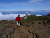 | Heute Morgen sieht das Wetter ziemlich wolkig aus. Also entschließen wir uns operativ, einfach den Wolken auszuweichen und auf das Dach La Palmas zu fahren. Via Santa Cruz fahren wir hinauf auf die Höhenstraße und parken am Mirador de Franceces unser Auto. Von hier startet unsere Panoramatour. Nach wenigen Minuten passieren wir die Pared de Roberto (Wand des Roberto). Als wir um die folgende Felsspitze kommen, sehen wir schon unser Tagesziel, den Roque de los Muchachos und einige der Observatorien. Ebenso hat man phantastische Tiefblicke in den Kessel der Caldera de Taburiente. Der Blick reicht über 1000m in die Tiefe der Caldera und am Horizont kann man das fast 2500m tiefer liegende Meer erkennen. Nachdem wir den Pico de Fuente Nueva passiert haben steigen wir hinauf zum höchsten Gipfel La Palmas. Hier gehen wir noch einige 100 Meter auf einen Felsvorsprung hinaus. Inzwischen ziehen mehr und mehr Wolken auf und unser Weg geht auf gleicher Strecke zurück zum Auto. Am Auto wieder angekommen fahren wir die Höhenstraße in Richtung Garafia hinunter (...am Wochenende wird glücklicherweise nicht gebaut und die Straße ist offen) und über Puntagorda und Tijarafe fahren wir zurück nach El Paso. | |||