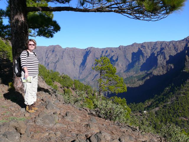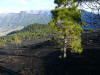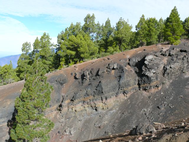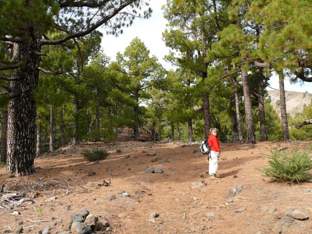 | Heute Morgen ist wieder Kaiserwetter und selbst der Birigoyo ist ohne jede Wolke. Also ist die Richtung damit schon vorgegeben. Wir fahren mit unserem Miet-Hyundai hinauf zur Zona Recreativa El Pilar. Dort beginnt die Ruta de los Volcanes. Zu Beginn geht es recht steil bergan und wir passieren den Abzweig zum Birigoyo-Gipfel. Nachdem der Weg immer weiter mal durch schwarze Lavafelder und mal durch herrlichen Pinienwald führt, erreichen wir bald daruf den markanten Krater des Hoyo Negro, welcher 1949 letztmalig ausgebrochen ist. Am Horizont ist auf wieder Teneriffa und der Teide und auch La Gomera zu erkennen. Zur anderen Seite erspähen wir noch El Hierro. Da wir aus logistischen Gründen nicht bis Fuencaliente wandern können, gestalten wir unseren Weg als Rundtour und drehen eine Runde vorbei an den Kratern Duraznero und La Deseda I und II. Auf dem Rückweg frischt der Wind dann ziemlich auf und wir sind froh, dass wir wieder in den Pinienwald bei El Pilar eintauchen können. Nach Zwischenstopp im Quartier essen wir heute im "Barbanera" bei Carlos, dem kanarischen Fernsehkoch, in El Paso. Auch hier sehr lecker in typischer Atmosphäre. | |||