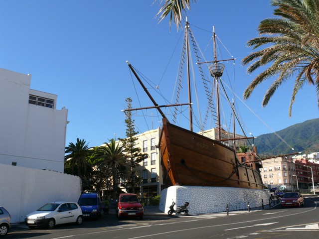 | Auch heute hat uns der Calima fest im Griff. Es ist relativ warm, windig und die Sicht ist sehr eingeschränkt. Da der Staub eher in tieferen Luftschichten liegt versuchen wir unser Glück oben auf den Bergen. Also fahren wir hinauf zu den Roques und parken am Abzweig der Piste zum Pico de la Nieve. Hier beginnt unser Weg hinauf zum "Schneegipfel". Als wir oben ankommen entwickelt sich der stramme Wind schon fast zum Orkan. Unsere These bestätigt sich zwar und wir können bis nach Teneriffa sehen, doch der Sturm wedelt und fast vom Kamm. Also nehmen wir nur einen kurzen Blick in die Caldera mit und machen uns auf den Rückweg. Der führt uns wieder über Santa Cruz, wo wir in der Nähe der Santa Maria-Nachbildung einen Parkplatz finden. Auch hier macht sich der Sturm deutlich bemerkbar, denn die Wellen schiessen über die Mauer an der Avenida Maritima hinweg und fluten die Hauptstraße in weiten Teilen. Wir suchen uns ein Plätzchen an der Placeta, wo wir im Windschatten sind, so dass wir im kleinen Restaurant wirklich hervorragend speisen. Am Abend drehen wir dann noch eine Runde durch Los Llanos und beobachten das Treiben auf der Plaza Espana. | |||