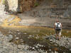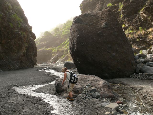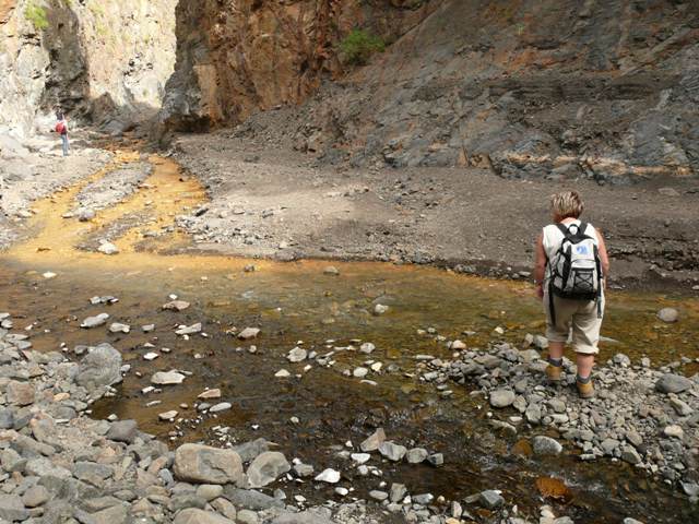 | Heute ist es endlich soweit, die Königstur von La Palma steht auf dem Programm. Da zur Zeit die Piste nach Los Brecitos hinauf geteert wird (...inzwischen ist sie fertig...) fahren die Jeeptaxis nur sonntags. Früh sind wir die Ersten im Talgrund und nachdem sich noch weitere Mitfahrer gefunden hatten, starten wir hinauf nach Los Brecitos. Leider hat über Nacht der Calima noch ziemlich zugelegt, so dass wir bei starkem Wind und totalem Dunst oben ankommen. Glücklicherweise legt sich der Wind, sobald wir in den Kessel der Caldera eintauchen. Doch die Sicht ist ziemlich eingeschränkt, man kann den Bejenado und den Roque Idafe nur erahnen. Einige Zeit später erreichen wir die Playa de Taburiente und an der Zona Acampada machen wir ein erstes Picknick. Das folgende Stück über den Reventon ist in ziemlich schlechtem Zustand und wird gerade instand gesetzt. Als wir wieder auf den Taburiente-Bach stoßen, nehmen wir erst einmal ein erfrischendes Bad in einer Gumpe. Nun machen wir einen Abstecher zur Cascada de Colores, wozu wir zwangsläufig die Wanderstiefel ausziehen müssen und knietief durchs Wasser waten müssen. Doch der Anblick entschädigt für diese Einlage und wir machen auch hier noch mal eine kleine Pause. In Dos Aguas haben wir dann einige Mühe trockenen Fußes durch den Fluss zu kommen, was uns aber letztendlich gelingt. Dann führt uns der Weg immer weiter hinaus aus der Caldera und nachdem der Weg ständig zwischen dem Flussbett und diversen Umgehungen am Hang wechselt, erreichen wir wieder den Parkplatz im Barrancogrund. Zurück im Quartier springen wir noch schnell in den Pool, der aber auch nicht wärmer als die Badegumpe in der Caldera ist. | |||