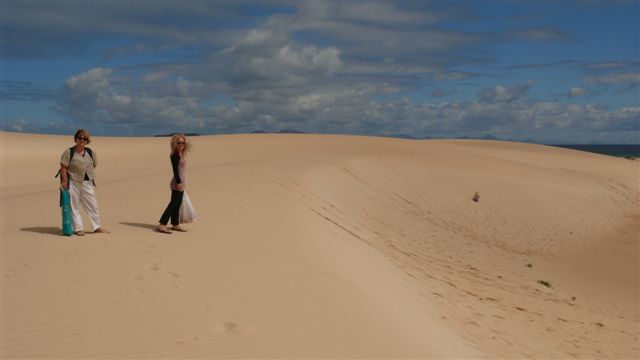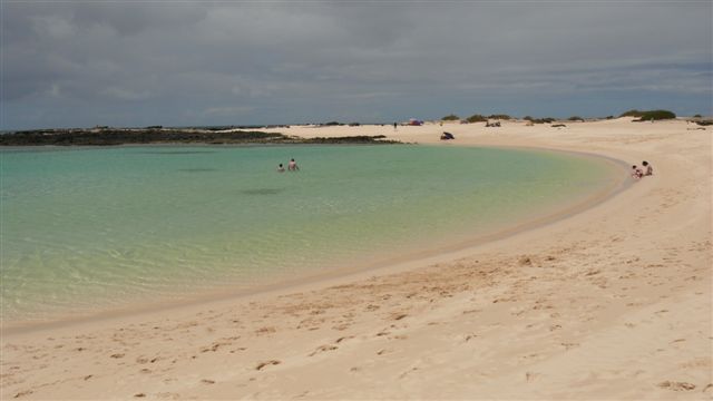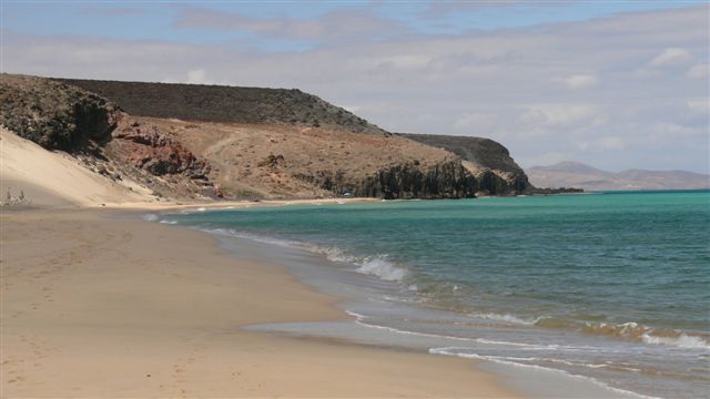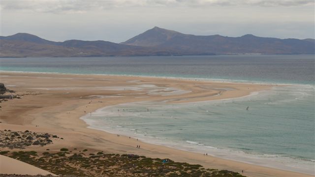 | Wie wir schon vor ein paar Wochen auf La Gomera erlebt haben ist die Trefferquote des Wetterberichtes eher gering. Bei den zur Verfügung stehenden 6 Varianten inklusive des lokalen kanarischen Fernsehens können wir zwischen Regen, leicht bewölkt, stark bewölkt und sonnig wählen. So starten wir bei starker Bewölkung von Jandia aus in Richtung Norden. Nach ca. 1 1/2-Stunden erreichen wir das Dünengebiet "El Jable" bei Corralejo im Inselnorden. Bei den RIU-Hotels parken wir uns schlendern am scheinbar endlosen Strand entlang. Da sich inzwischen die Wolken verzogen haben fahren wir noch ein paar Meter nach Süden und suchen uns eine Kuhle in den Dünen. Dazu genießen wir den Sonnenschein bei einem kühlen Bad im Atlantik. Gegenüber liegt Lanzarote im strahlenden Sonnenschein scheinbar zum Greifen nah. Leider bewölkt es sich zusehends so dass wir uns entschließen, auf die Westseite der Insel nach El Cotillo zu wechseln. Nach ca. 25 Minuten Fahrt erreichen wir die Sandbuchten bei El Cotillo und hier werden wir wieder von der Sonne begrüßt. Bei idealen Badewetter erleben wir in einer türkisblauen Lagune einen tollen Strandnachmittag. Dann fahren wir durch die Inselmitte via Antigua wieder zurück nach Morro Jable wo wir an der Promenade im Restaurant Leo's lecker zu Abend essen. | ||||