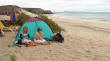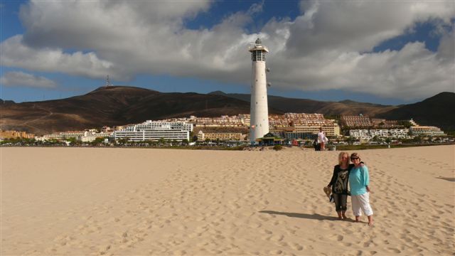 | Heute Morgen beginnen wir mit dem Frühstück auf unserer Terrasse. Kaum ist der Kaffee in der Tasse werden wir von leichtem Regen überrascht. Glücklicherweise hält der sich nur kurz und so entschließen wir uns zuerst kurz an die Playa Jandia zum Leuchtturm zu fahren. Hier inspizieren wir kurz den Strand in der Nähe des Leuchtturmes. Da es hier aber ziemlich touristisch ist und Sonnenliegen und Schirme das Strandbild prägen fahren wir weiter zur Playa Mal Nombre. Nachdem wir zuerst unsere Strandmuschel aufgebaut haben ziehen wir kurze Zeit später in eine Strandburg um, um dem ziemlich heftig blasenden Wind zu entgehen. Die Sonne scheint inzwischen intensiv vom stahlblauen Himmel. Leider legt auch der Wind noch weiter zu, so dass wir schon teilweise "Sandstrahlfeeling" haben. Dadurch entschließen wir uns nach Morro Jable an den Coronado-Beach zu fahren. Hier ist der Wind deutlich weniger und wir können hier richtig toll baden. Hier erleben wir die Abendsonne, welche den Strand in ein goldgelbes Licht taucht. | ||||