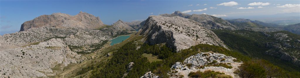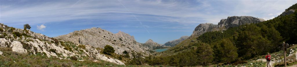 | Heute starten wir gegen 08:45 Uhr von der Finca Roqueta in Richtung Tramuntana. Hinter dem Kloster Lluc machen wir am Mirador de Escorca den unvermeidbaren Kurzstopp, um die Aussicht hinunter zum Torrent de Parreis zu genießen. Nach einer reichlichen Stunde Anfahrt erreichen wir den Startpunkt zu unserer heutigen Wanderung am Embassement de Cuber. Trotz der frühen Stunde sind die Parkplätze hier oben schon gut belegt. Am Ostufer des Stausees wandern wir bis zur Staumauer und überqueren diese. Der weitere Weg führt uns durch ein Hochtal bis zum Coll de Cuber, einem kleinen Pass oberhalb des Tales. Während des ganzen Weges haben wir ein tolles Panorama hinüber zum Puig Major, dem höchsten Berg Mallorcas. Vom Pass aus umrunden wir den Gipfel des L' Ofre um dann von der Ostseite über einen ziemlich steilen Aufstieg hinauf zum Gipfel zu gelangen. Hier oben erleben wir bei Windstille ein überragendes Panorama. Im Süden sehen wir den Galatzo und den Esclop, im Westen liegt Soller und Port de Soller wie auf einer Modelleisenbahn vor uns und Richtung Norden sehen wir die Bergwelt der Tramuntana und die beiden Stauseen Cuber und Gorg Blau. Richtung Osten sehen wir die Tafelberge bei Alaro und die zentrale Ebene, die Pla, vor uns liegen. Nach kurzem Biwak geht es hinunter und nach ca. 4 Stunden stehen wir wieder am Ausgangspunkt am Parkplatz an der Tramuntanastraße. Dann fahren wir via Pollenca an den Strand bei Platja de Muro, wo wir kurz am Strand relaxen. Zurück in der Finca Roqueta genießen wir die Abendsonne und lassen den Tag auf der Terrasse ausklingen. | |||