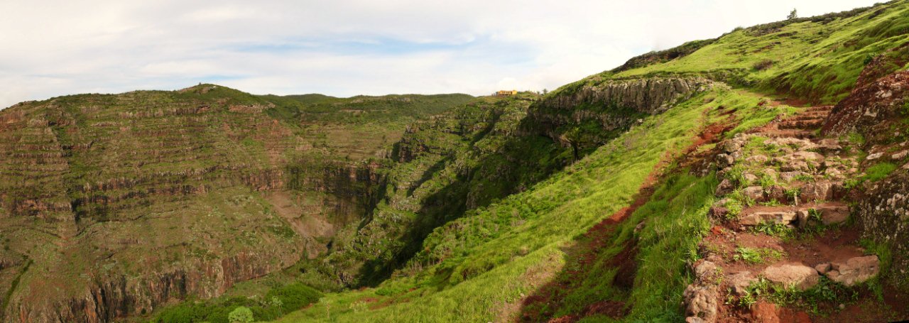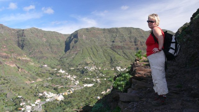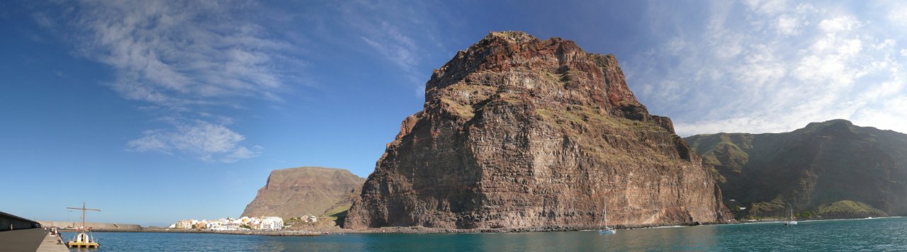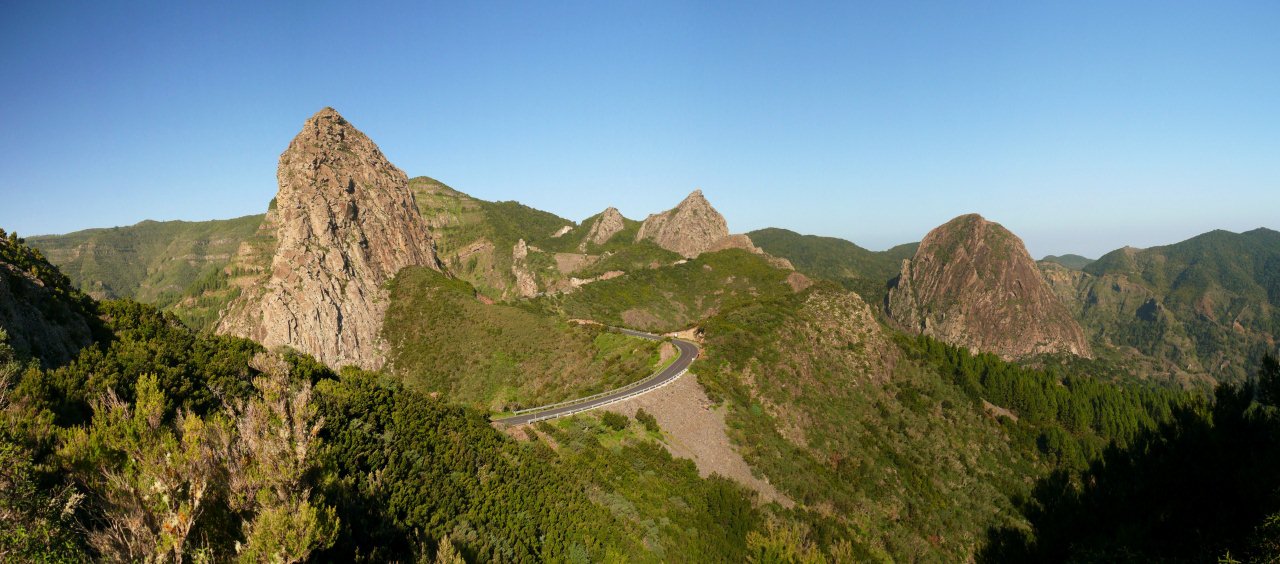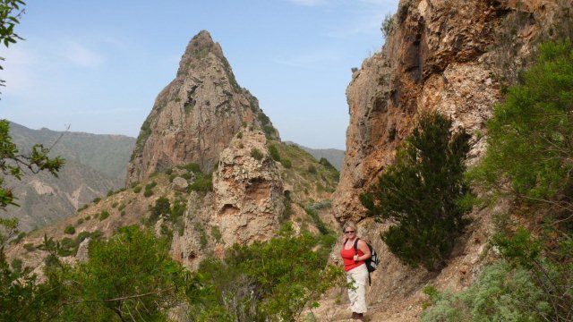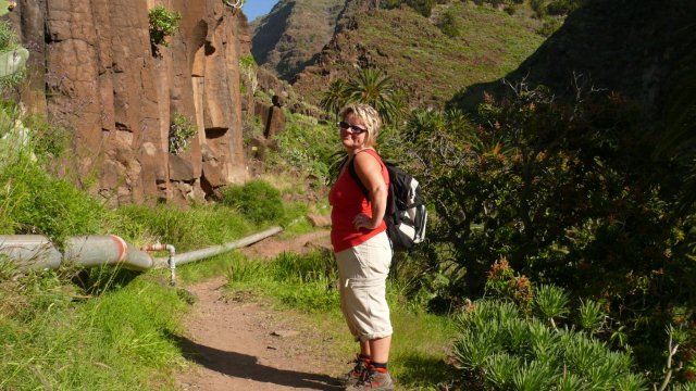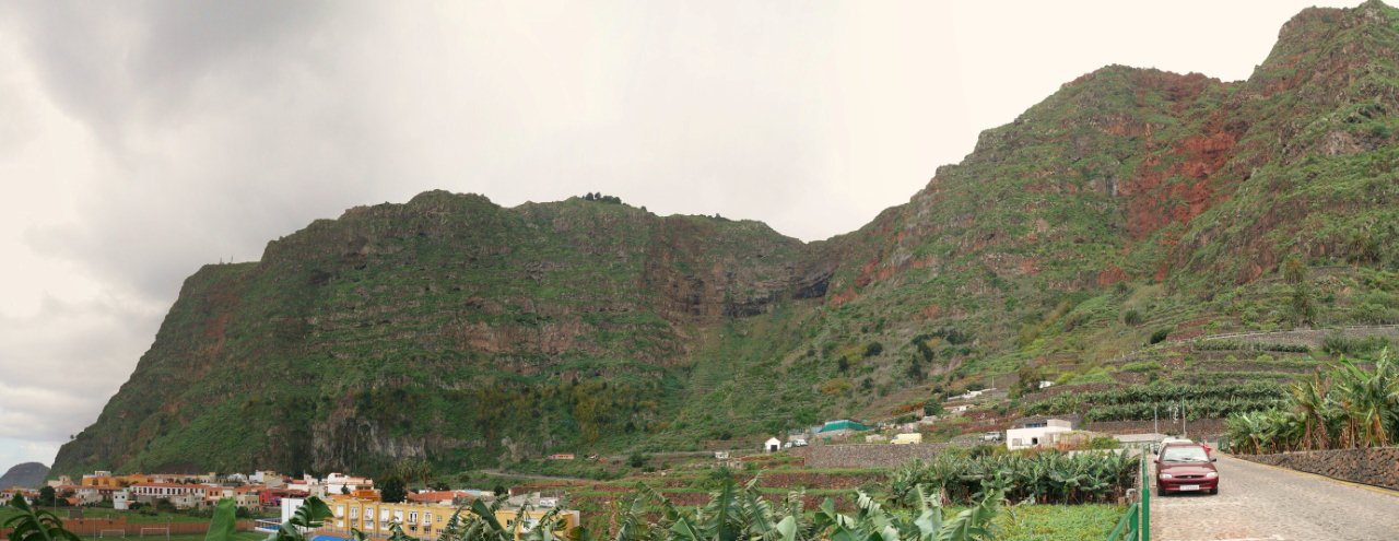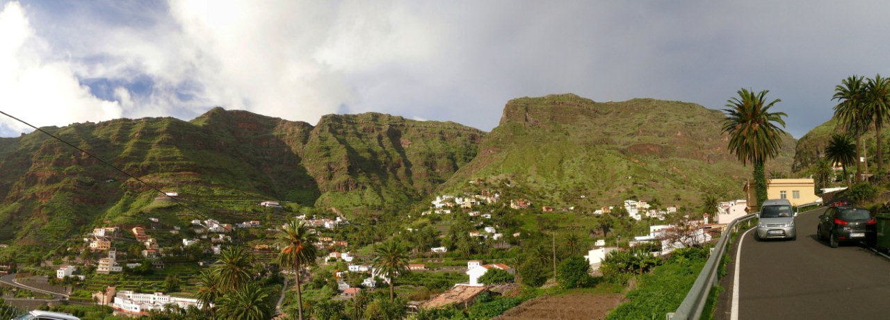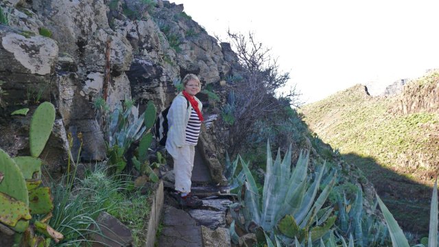 | Nach dem obligatorischen Terrassenfrühstück fahren wir heute Morgen nach Vallehermoso im Nordwesten der Insel. Hierher führt eine neu ausgebaute Straße, deren Vorgänger wir noch als enge Piste kennen. Dank diverser Fördermittel ist sie nun breit ausgebaut worden. Nur hat man die Topographie der Insel unterschätzt denn trotz vieler Mauern und Netze ist an vielen Stellen die neue Straße wieder mit Steinen übersät. Die Ausbesserungsarbeiten sind noch in vollem gange und so müssen wir mehrere kurze Stopps einlegen, da Bauarbeiten im Gange sind. In Vallehermoso angekommen parken wir unweit der Tankstelle und nehmen die kleine Straße hinauf nach Garabato. Anfänglich ist die Straße noch asphaltiert doch kurze Zeit später wird sie zur Piste. Bald schon sehen wir in luftiger Höhe El Tion herausschauen. Um dort hinauf zu gelangen biegen wir kurz vor einer Staumauer auf einen Felsrücken ab welcher in vielen Kehren und Steinstufen steil hinauf nach El Tion führt. Von El Tion aus geht der Weg zum Restaurante Roque Blanco, welches in exponierter Lage hoch oben am Rand des Tales liegt. Hier beginnt auch der Abstieg hinunter zum Roque Cano. Der Weg führt zuerst leicht abschüssig auf einen Felsrücken am Fuße des Roque Cano, welcher bald vor uns aufragt. Von hier aus geht der Weg teilweise in Serpentinen abwärts und bringt uns zurück nach Vallehermoso. | ||||
