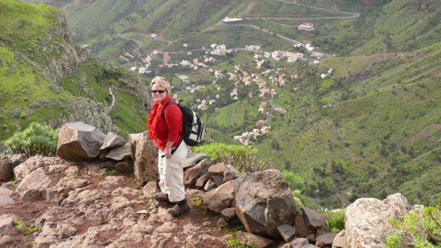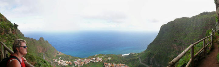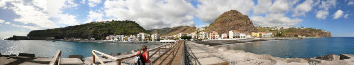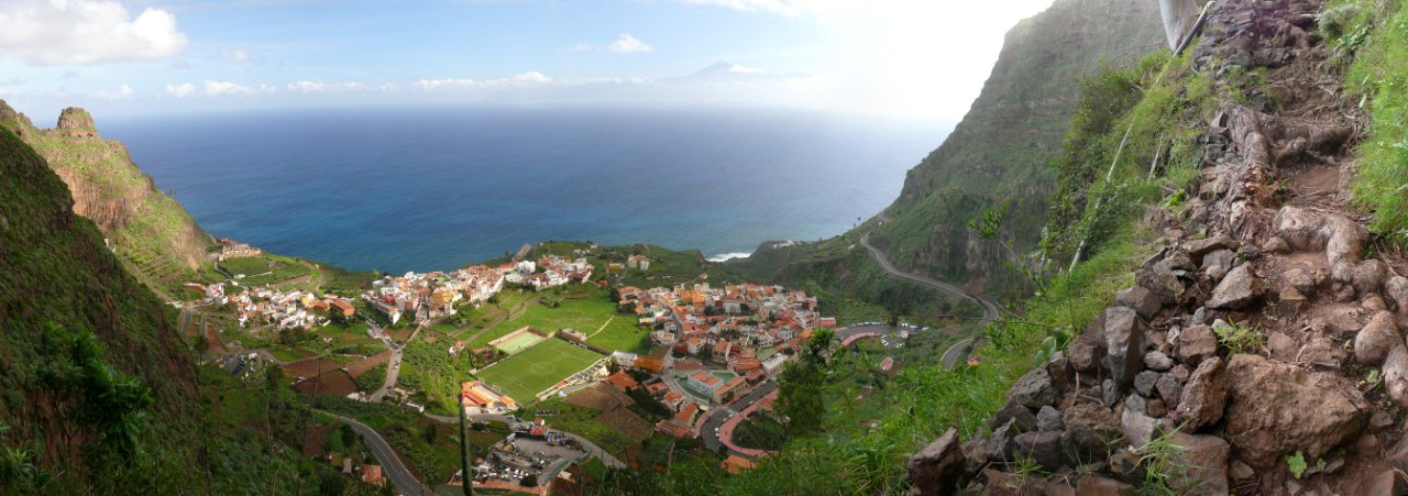 | Da wir ab heute keinen Mietwagen mehr zur Verfügung haben sind wir wieder auf den Bus angewiesen. So klingelt der Wecker wieder um 06:30 Uhr, was im Urlaub schon arg zeitig ist. Mit dem 08:00 Uhr Bus fahren wir hinauf bis zum Startpunkt unseres Abstieges (1100 Hm führt er uns hinab), dem Roque Agando. An der Höhenstraße ist es schon recht frisch und es weht auch ein kalter Wind über den Kamm. So mussten wir erstmals seit wir dieses Mal hier sind die Jacken aus dem Rucksack holen. Schon nach wenigen Metern können wir diese wieder verpacken da der Barranco meist im Windschatten bleibt. Die Vegetation ist hier schon weiter als an anderen Ecken der Insel. So verläuft unser Weg im Mittelteil durch eine Vielzahl von blühenden Mandelbäumen. Nach einer Stunde erreichen wir den Weiler Benchijigua, welcher auch dem Barranco seinen Namen gibt. Nach einem kurzen Picknick (...das Frühstück ist heute sehr kurz ausgefallen) starten wir zum nächsten Abschnitt, dem Abstieg nach Pastrana. Entlang des Barranco passieren wir das Dorf Lo del Gato und kommen nach einer weiteren Stunde in Pastrana an. Weiter geht es an der östlichen Barrancoseite nach Taco. Auf der Straße geht der weitere Weg nun bis nach Playa Santiago. Da dieser Abschnitt wenig idyllisch ist bemühen wir den Daumen und haben auch bald Glück. Das Postauto nimmt uns mit nach Santiago. Hier nutzen wir die Gelegenheit für ein erfrischendes bad im Atlantik. Nach kurzer Wartezeit läuft die Benchi-Express im Hafen ein und bringt uns wieder zurück ins Valle Gran Rey. Nach einem kurzen Stopp im Quartier erleben wir an der Puntilla den Sunset und lassen den Tag beim Abendessen in unserem Stammlokal, dem "Abisinia" ausklingen. | ||||