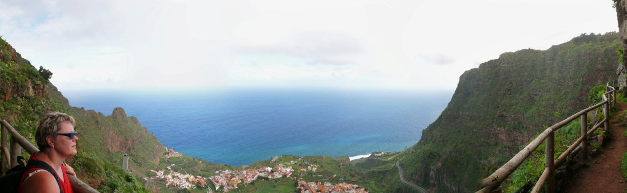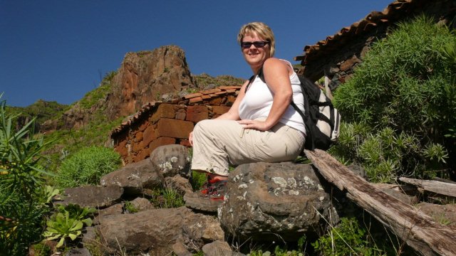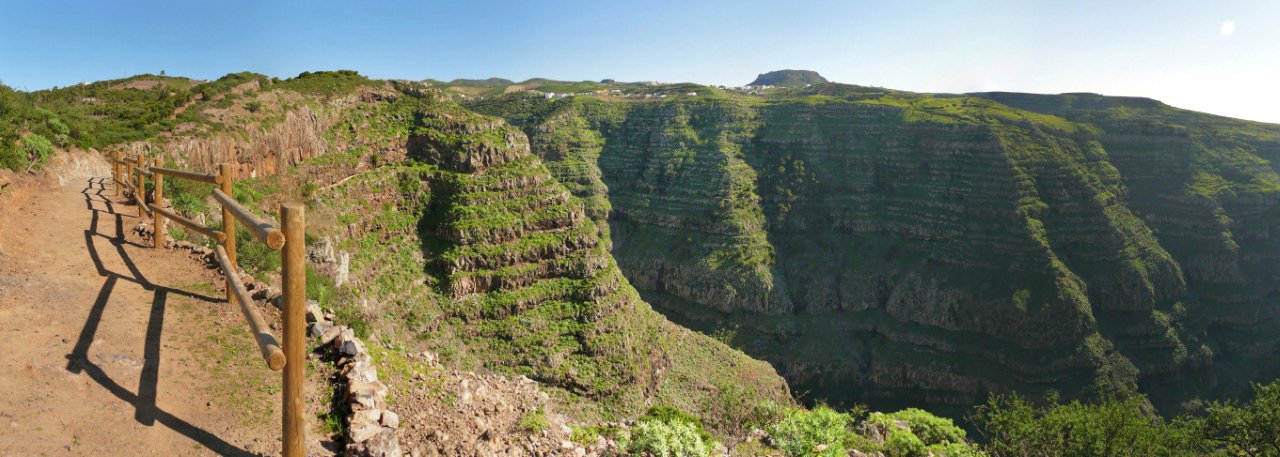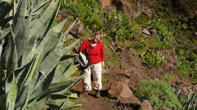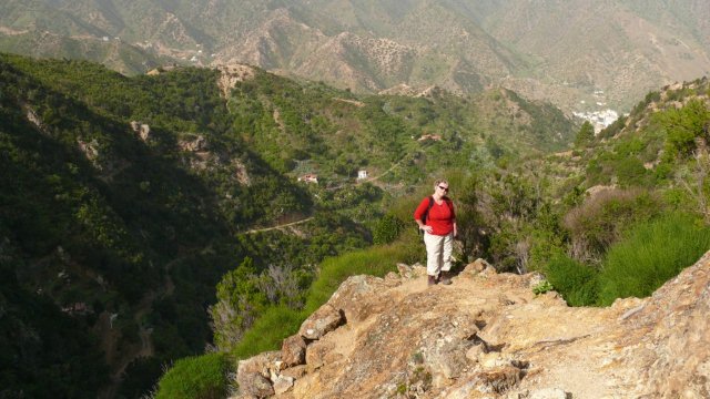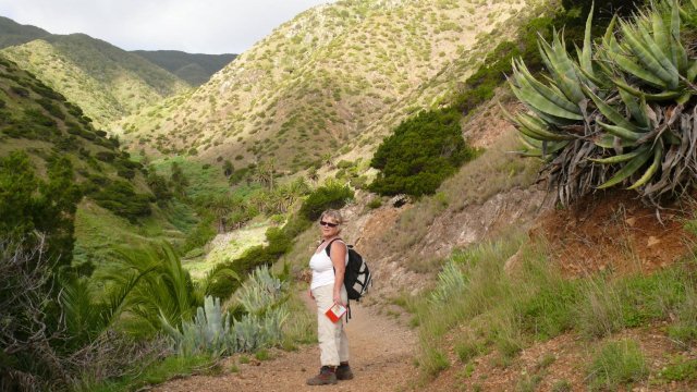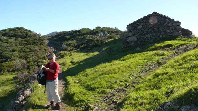 | Auch heute zu Los Reyes zeigt sich das Wetter von der besten Seite. So frühstücken wir bei wolkenlosen Himmel wie immer auf der Terrasse und fahren anschließend über die Carretera Dorsal, die Höhenstraße, hinunter nach Imada, dem Startpunkt unserer heutigen Rundwanderung. Wir finden einen der letzten Parkplätze in Imada und beginnen an der Bar Acrilia unseren Aufstieg hinauf nach El Azadoe. Seit unserer letzten Begehung vor ziemlich genau einem Jahr ist der Weg instand gesetzt worden und hat im Bereich des Ortes Imada sogar an manchen Stellen ein Geländer. Nach steilem Aufstieg geht der Weg dann wieder in einen Barranco hinein und bald erreichen wir den Lomo del Gato, den Katzenbuckel, wo die verfallenden Häuser von El Azadoe zu finden sind. Der Weg führt nun immer weiter hinunter und man hat immer den gewaltigen Barranco de Guarimiar im Blick. Dann führt der Weg Höhe haltend wieder zurück nach Imada. Da es heute ziemlich heiß ist fahren wir nach Ende der Wanderung hinunter nach Playa Santiago. Nach kurzen Stopp an der Playa fahren wir gleich weiter zur Playa del Medio, wo wir den Nachmittag bei angenehmen Badewetter verbringen. Gegen 16:30 Uhr brechen wir auf und fahren via Chipude, El Cercado zurück ins Valle Gran Rey wo wir den Tag beim Sunset bei Maria ausklingen lassen. | ||||
