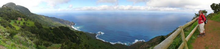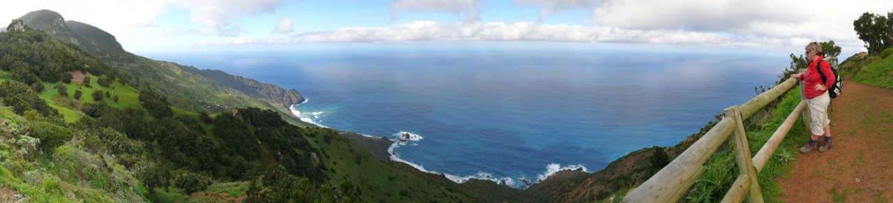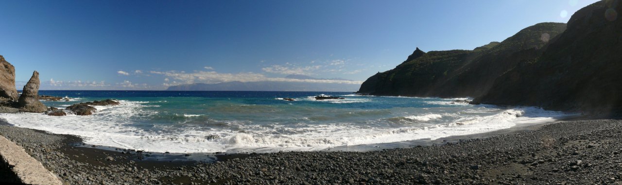 | Nach der gestrigen längeren Wanderung lassen wir es am heutigen Tag, dem letzten mit Mietwagen, etwas ruhiger angehen. Am Morgen fahren wir wie immer hinauf auf die Höhenstraße und via La Laguna Grande durch den El Cedro hinunter nach Hermigua im Norden der Insel. Der Nebelwald macht heute seinem Namen alle Ehre und es ziehen dicke Schwaden durch den Lorbeerwald. Unten an der Nordküste ist es hingegen deutlich sonniger. Als wir die Küste bei Hermigua erreichen lacht die Sonne vom blauen Himmel. So fahren wir die kleine enge Straße zur Playa Caleta hinunter. Seit einigen Jahren ist diese asphaltiert. Wir kennen die Straße noch als steinige Piste welche nur mühsam zu befahren war. Unten angekommen genießen wir nach Panorama auf die Steilküste und den Blick auf Teneriffa, welches sich heute recht deutlich zeigt. Auf dem selben Weg geht es wieder hinauf. Dann führt uns der weitere Weg über die Degollada de Peraza und von da hinunter nach Playa Santiago an die Playa del Medio. Leider ist es hier etwas wolkig aber trotzdem sehr angenehm. Trotz der Wolken relaxen wir am Strand und baden im Atlantik. Am späten Nachmittag fahren wir dann retour ins Valle und erleben den Sonnenuntergang im "Paraiso", unmittelbar am Strand von La Playa. | ||||
