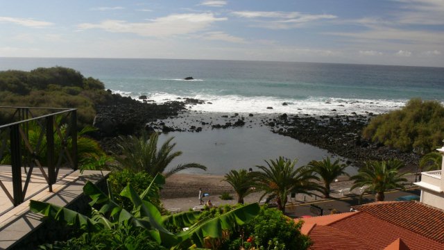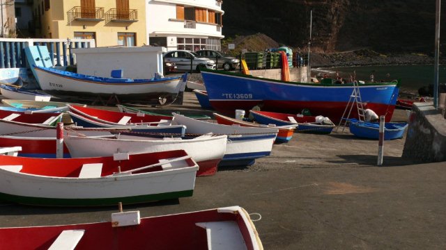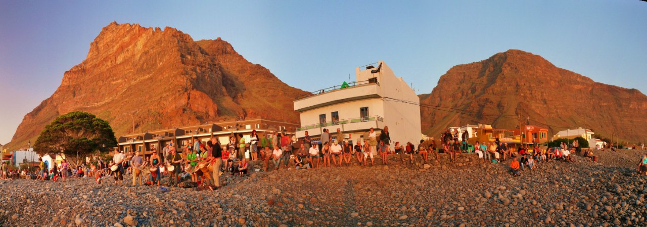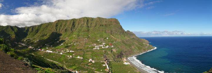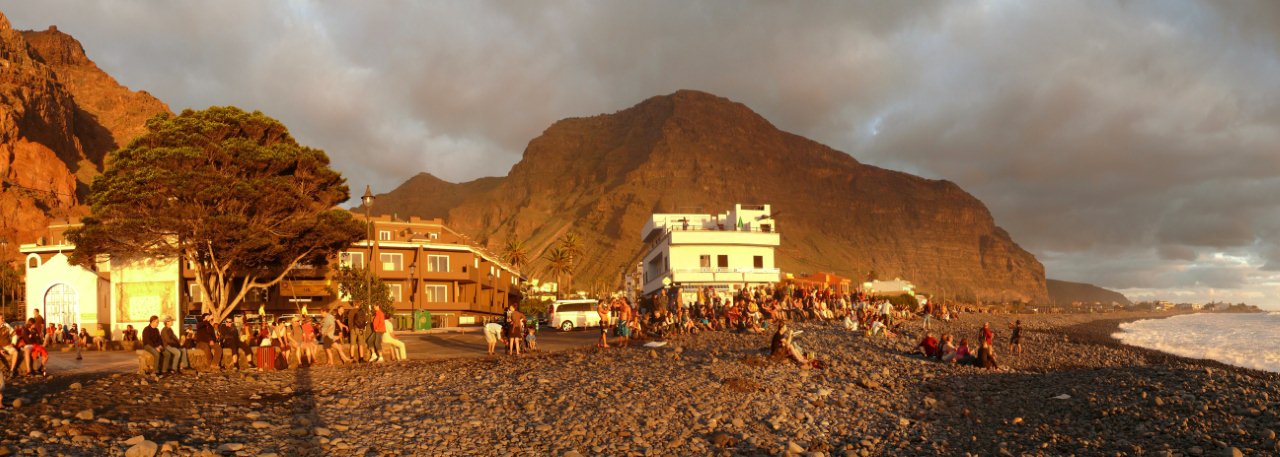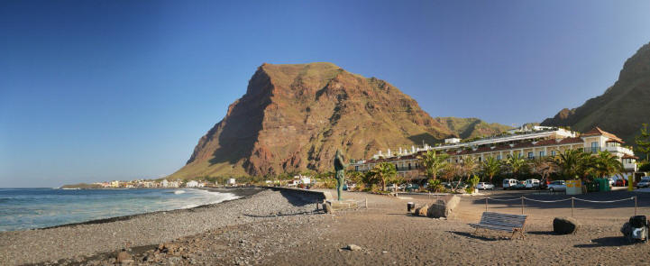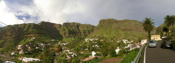Der Tag beginnt auch heute mit einem Frühstück bei herrlichen Sonnenschein auf unserer Terrasse. Anschließend übernehmen wir unseren reservierten Mietwagen von CICAR und fahren via Arure aus dem Tal heraus. Weiter führt uns unsere Fahrt hinunter zur Westküste nach Alojera. Wir fahren aber nicht in den Weiler sondern biegen gleich nach Taguluche ab. Nach vielen Kurven erreichen wir das verschlafene Nest und machen einen Abstecher zur Playa Guariñen. Hier haben wir im Sommer mehrmals an einem schönen einsamen Sandstrand gebadet. Momentan ist der Strand, wie meist vor allen in den Wintermonaten, eine einzige Geröllhalde. Dennoch ist die Kulisse der Galionberge sehr imposant. Ebenso die idyllische Lage des Palmendorfes Taguluche mit seinen Terrassenfeldern und einer Vielzahl von Dattelpalmen. Nach einigen Fotos fahren wir die Serpentinenstraße wieder hinauf und biegen auf der Hauptsstraße nach Vallehermoso ab. Die Straße ist nach jahrelangen Bauarbeiten in einem guten Zustand. Noch vor einiger Zeit war sie doch recht ambitioniert zu befahren. Weiter geht es nach Las Rosas. Hier biegen wir auf die Straße hinauf zum Besucherzentrum Juego de Bolas ein und fahren durch herrlichen Lorbeerwald bis wir die Carretera Dorsal erreichen. Am Parajito nehmen wir den Abzweig nach Playa Santiago und verbringen den Nachmittag an der Playa del Medio. Bei angenehmen Sonnenschein, 24°C und kaum Wellengang kann man heute hier schön schwimmen und einfach die wärmende Sonnen genießen. Via Igualero, Chipude und El Cercado fahren wir am späten Nachmittag zurück ins Valle Gran Rey. Nach ein paar Einkäufen geht's dann wie immer zur Playa zum Sonnenuntergang. |