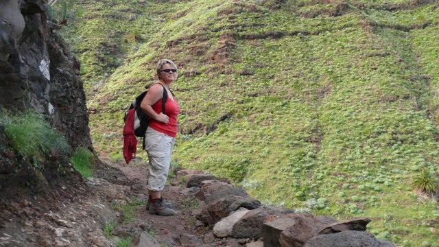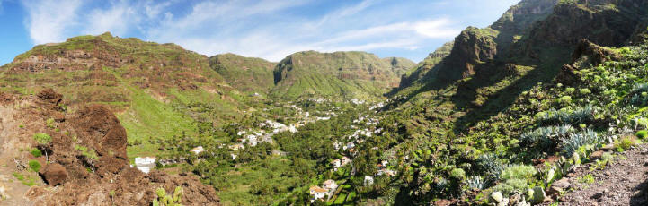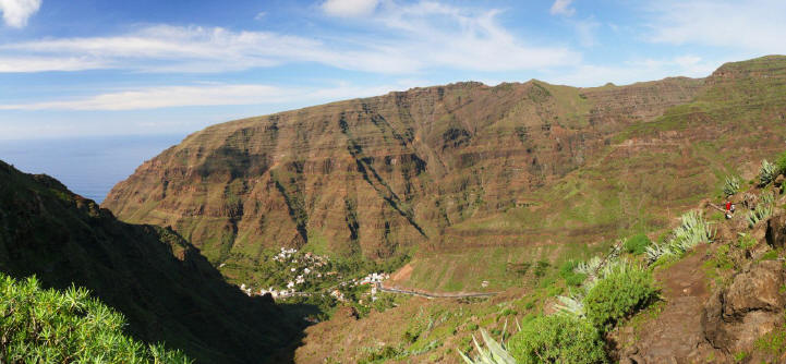 | Nachdem uns gestern der Wecker sehr früh geweckt hat verzichten wir heute mal auf dessen Dienste. Mit der aufgehenden Sonne genießen wir das Terrassenfrühstück. Anschließend bummeln wir bei wolkenlosen Himmel und Windstille durchs Valle. Nach ein paar Einkäufen machen wir es uns in der Sonne bequem. Da wir das geniale Wetter nutzen wollen fahren wir dann anschließend mit dem 14:00 Uhr-Bus hinauf nach Las Hayas, wo wir hinter der Casa Efigenia in den sog. "Mastenabstieg" hinunter ins Valle Gran Rey einsteigen. Im oberen Teil grüßt die Fortaleza herüber und wir sehen, wie sich unsere Route vom Abstieg von El Cercado ins Tal schlängelt. Das Valle Gran Rey liegt wie im Miniformat direkt unter uns. Es wirkt wie auf einer riesigen Modelleisenbahn und die Dimensionen sind recht gewaltig. Diese Abstiegsroute ist vor allem in den Nachmittagsstunden zu empfehlen, da dann die Sonnen das gesamte Tal ausleuchtet. Der Weg ist seit unserer letzten Begehung im vergangenem Jahr ausgebaut worden und so finden sich an einigen Stellen gemauerte Stufen und Seitenbegrenzungen. Im oberen Teil sind sogar einige Geländer angebracht worden. Trotzdem sollte man für den Abstieg einigermaßen schwindelfrei sein. Für uns ist diese Route die eindrucksvollste von den Abstiegen ins Valle Gran Rey. Nach steilem Abstieg erreichen wir nach ca. 1 1/2-Stunden die kleine Nebenstraße bei Lomo del Balo. Von hier geht es via la Vizcaina, El Hornillo und Chelé zur Ermita de los Reyes und weiter durch den Barranco nach La Playa, wo wir pünktlich zum Sunset eintreffen. | ||||