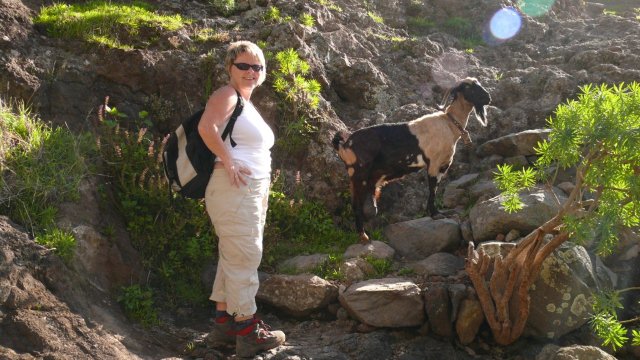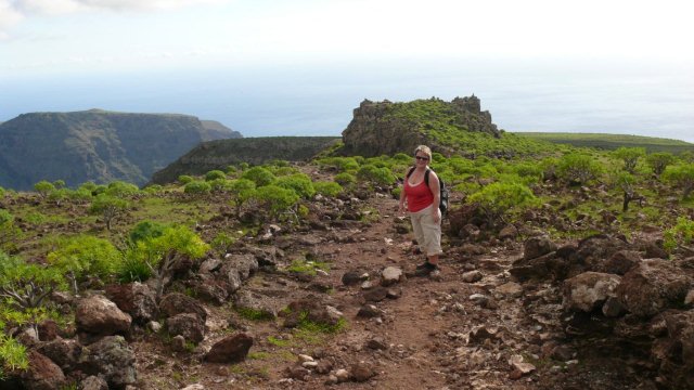 | Auch heute Morgen ist das Wetter wunderbar. So starten wir nach dem Frühstück hinauf zur Höhenstraße. Zufällig treffen wir unsere Wanderbekanntschaft, ein Paar aus Holland wieder und so fahren wir gemeinsam bis zum Roque Agando. Hier beginnen wir unsere Rundwanderung um die Roques. Am Fuße des mächtigen Roque Agando gehen wir entlang der Höhenstraße nur wenige hundert Meter, um dann in einen Weg hinauf in Richtung Ermita de las Nieves abzubiegen. Glücklicherweise macht diese heute ihrem Namen keine Ehre (Schneekapelle). Gegenüber sehen wir gerade noch im Dunst den Teide auf Teneriffa. Der weitere Weg führt uns zur Degollada de Peraza wo unser Steilabstieg hinunter ins Tal von La Laja beginnt. Nachdem wir im letzten Jahr den Weg als sehr rutschig erlebt haben ist es dieses Jahr deutlich trockener und damit ist der Weg wesentlich besser begehbar. Kaum haben wir das Tal bei La Laja erreicht beginnt auch schon der Wiederaufstieg hinauf zur Höhenstraße. Glücklicherweise führt der Aufstieg durch Kiefern- und Baumheidewald und ist somit recht schattig, was in Angesicht der warmen Temperaturen hilfreich ist. Nach der reichlichen Hälfte des Wiederaufstieges erreichen wir die Schutzhütte Degollada del Tanque, wo wir am Fuße des Roque Ojilia ein kurzes Picknick machen. Die alte Hütte verfällt von Jahr zu Jahr und bald schon wird nur noch ein Schutthaufen zu sehen sein. Von hier brauchen wir noch ca. 45 Minuten bis zurück zum Auto. Über die Carretera Dorsal fahren wir zurück ins Valle Gran Rey wo wir erst ein paar Versorgungen machen und dann und kurz im Pool abkühlen. Am Abend geht es zuerst zum Sunset bei Maria und anschließend ins "El Pescador" nach Vueltas. | ||||