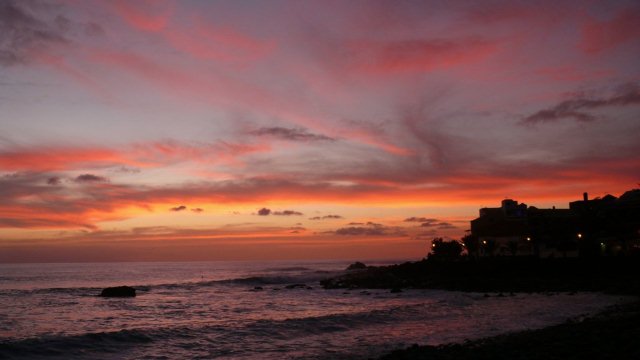| Naturgemäß schlafen wir heute mal etwas länger. Das neue Jahr empfängt uns mit einem herrlichen Wetter und so ist am Morgen keine Wolke am Himmel zu sehen. Unser Frühstück können wir im Sonnenschein auf unserer Terrasse genießen. Nach ausgiebigen Frühstück schlendern wir nach Vueltas, wo wir am Hafenstrand ein Sonnenbad nehmen. Auch testen wir das Wasser doch selbst hier am Hafen ist heute das Wasser unruhig. Draußen jenseits der Hafenmole brausen Riesenwellen (Mar de Fondo - Grundsee) herein. Als wir nach einem Zwischenstopp im Quartier nach La Playa laufen sehen wir, dass die Wellen zahllose Steine auf die Avenida Maritima geschleudert haben und diese deshalb gesperrt ist. Etwas später stehen wir dann an der Playa Inglés. Wie meistens ist im Uferbereich kein Sand dafür rollen auch hier große Brecher an den Strand. Nachdem wir einige Zeit dem Spektakel zugeschaut haben geht es zurück nach La Playa zu Maria, wo wir auch heute den Sonnenuntergang erleben. Zurück gehen wir dann nach Vueltas, wo wir im Abisinia leckere Chopitos (Minitintenfische) essen. | ||||