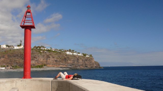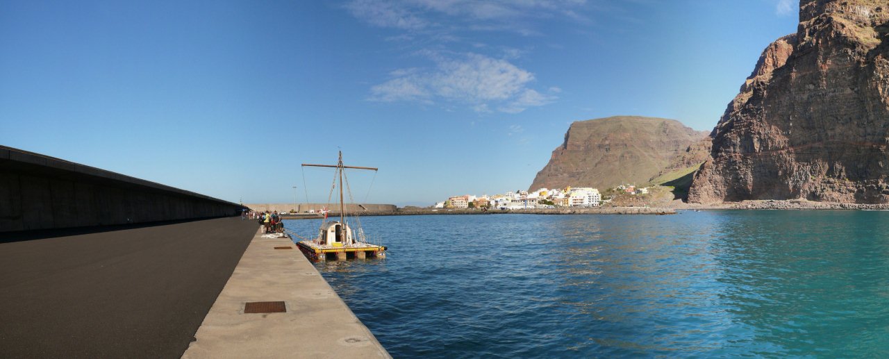 | Leider ist heute schon unser letzter Tag hier auf La Gomera, wenn man von dem morgigen Transfertag mal absieht. Daher steht heute auch keine Wanderung mehr auf der Tagesordnung sondern nur etwas Bummeln und Relaxen. Nach dem letzten Frühstück im Sonnenschein auf unserer Terrasse bummeln wir nach Vueltas. Dort im Hafen kann man momentan noch die Antiki bestaunen. Nachdem diese in den letzten Tagen noch an Land war liegt sie nun an der Mole des neuen Hafens und wartet auf den Start. Im Rahmen dieser Expedition wollen vier Mann den Atlantik in Richtung Bermudas überqueren und haben das Boot in Anlehnung an die "Kon-Tiki" von Thor Heyerdahl "Antiki" getauft. Auch wenn das Boot nicht aus Schilf sondern aus Kunststoff besteht so bleibt es doch ein riskantes Unterfangen in dieser Nussschale den Atlantik zu überqueren. An Land war ein Teil der Crew noch mit den Verstauen des Proviants beschäftigt. Dann relaxen wir noch in der Sonne und packen notwendigerweise die Koffer. Am Abend erleben wir noch den finalen Sundowner an der Playa um den Tag und damit den Urlaub im "Abisinia" ausklingen zu lassen. | ||||