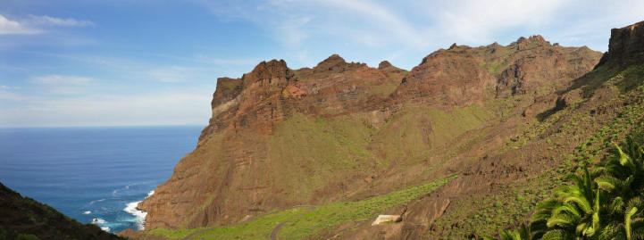 | Heute steht eine Tour auf unserem Programm, welche wir bisher noch nicht unternommen haben. Dazu fahren wir zum Startpunkt nach Vallehermoso, wo wir in den Barranco de la Era Nueva einsteigen. Dieser Weg bringt uns stetig nach oben. Zuerst führt er durch noch (oder wieder...) landwirtschaftlich genutzte Flächen, später hingegen durch einen urwüchsigen Barranco. Der Weg wird von Palmen und Bambus gesäumt. Nach ca. 1 1/2-Stunde Aufstieg erreichen wir die Cumbre und sehen schon die kleine Ermita Santa Clara. Während uns Roque Cano beim Aufstieg begleitet hat können wir nun zur anderen Seite schauen. Der Blick fällt tief ins Tal hinunter zur Küste bei Arguamul. Der Weg führt nun ohne große Steigungen entlang der Abbruchkante an der Westküste, so dass wir immer wieder spektakuläre Aussichten nach unten haben. Von hier müsste man auch La Palma sehen. Leider kann man von der Nachbarinsel fast nichts sehen, lediglich ein paar Häuser von Santa Cruz de la Palma sind im Dunst auszumachen. Bald schon kommt der Felsen von Los Organos ins Bild. Leider lassen die die markanten Basaltsäulen nur von der Seeseite aus sehen. Ähnlich wie gestern bei Juego de Bolas führt der Weg nun durch stark erodiertes Gelände. Trotz der vielen Erosionsspuren bietet das Areal ein tolles Farbenspiel. Kurze Zeit später stehen wir an der kleinen Ermita de la Virgen de Guadelupe. Besser als in den letzten Tagen sehen wir auch Pico del Teide auf Teneriffa. Ebenso kann man gut die Punta del Teno und die Westküste der großen Nachbarinsel ausmachen. Am Ende der Piste machen wir noch den kleinen Abstecher hinauf zur Punta de Alcala. Hier vom nordwestlichsten Zipfel von La Gomera hat man einen wunderbaren Blick zur Küste, nach Teneriffa und zur anderen Seite ins grüne Tal von Vallehermoso. Hier beginnt dann der Steilabstieg nach La Playa de Vallehermoso. In ca. 1 Stunde führt uns der Weg ca. 600 Hm hinunter. Der Weg ist ziemlich steil und rutschig doch die Panoramen nach allen Seiten sind sensationell. Dann sind wir wieder unten angekommen und müssen nun noch den Weg zurück nach Vallehermoso angehen, da dort ja der Mietwagen parkt. Dort angekommen fahren wir über die neu ausgebaute GM-1 zurück ins Valle Gran Rey, wo wir nach kurzem Zwischenstopp wie immer den Sonnenuntergang in La Playa erleben. Anschließend zieht es uns wieder ins "Abisinia" zum Abendessen. | ||||