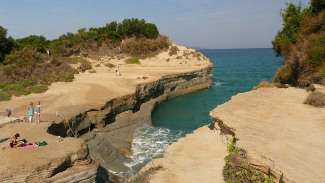 | Wie auch schon an den letzten Tagen beginnen wir den Tag mit einem Bad im Meer. Wir müssen die unmittelbare Strandlage unserer Unterkunft nutzen. Nach dem Frühstück starten wir in den Norden in Richtung Sidari. Der Ort selbst ist nicht gerade sehenswert, da es eine synthetische Urlaubssiedlung britischer Prägung ist. Wir wollen hier die schönen Felsbuchten und Sandsteinformationen an der Küste anschauen, den sog. Canal d`Amour. Nach kurzen Bummel über die Klippen fahren wir wenige Kilometer weiter zum nördlichsten Zipfel Korfus, dem Kap Drastis. Ein kurzer Spaziergang führt uns an die imposante Felsküste hinunter, wo die hellen Sandsteinfelsen aus dem türkisblauen Wasser aufragen. Weiter fahren wir dann zum Longas-Beach, wo wir ebenfalls von der Klippenküste hinunter aufs Meer schauen. Da der Strand bei Flut doch sehr schmal ist entschließen wir uns nach Agios Stefanos weiterzufahren, wo wir den Nachmittag am Strand verbringen. Den Rückweg nehmen wir dann auf der engen Bergstraße über Makrades und Paleokastritsa, um am Liapades-Beach nochmal kurz vorbeizuschauen. Da es hier ganz schön voll ist fahren wir gleich weiter zum Mirtiotissa-Beach. Leider gibt es hier überhaupt keine Parkplätze mehr, so dass ein längerer Anmarsch für einen Kurzaufenthalt nicht sinnvoll ist. So fahren wir über Glyfada und Pelekas wieder zurück nach Agios Gordios. Zum Abendessen sind wir heute in unserer "Haustaverne" im Romantic Palace. Heute steht Lammbraten vom Spieß auf dem Programm und es wird ein sehr langer griechischer Abend.... | ||||