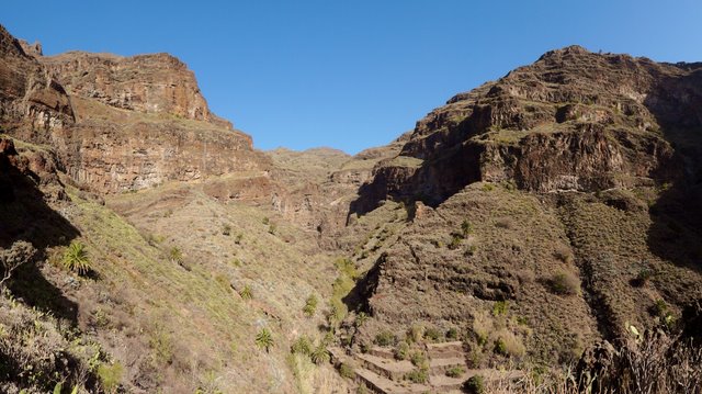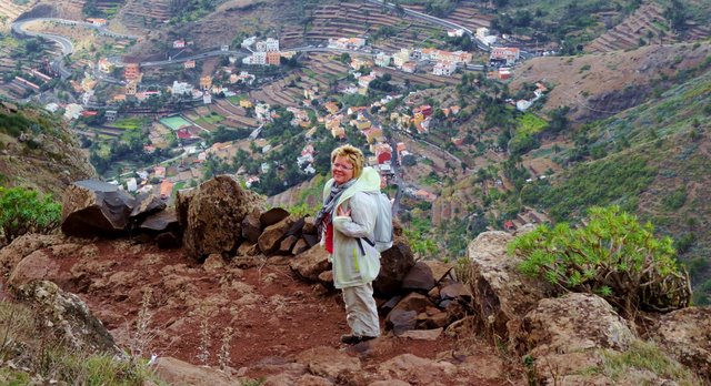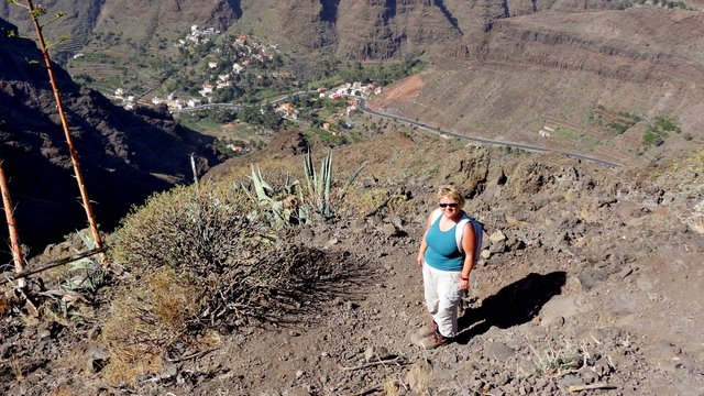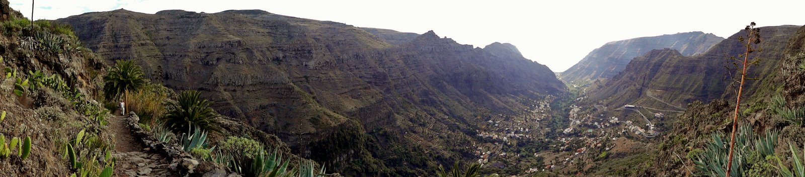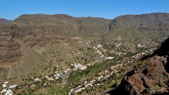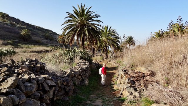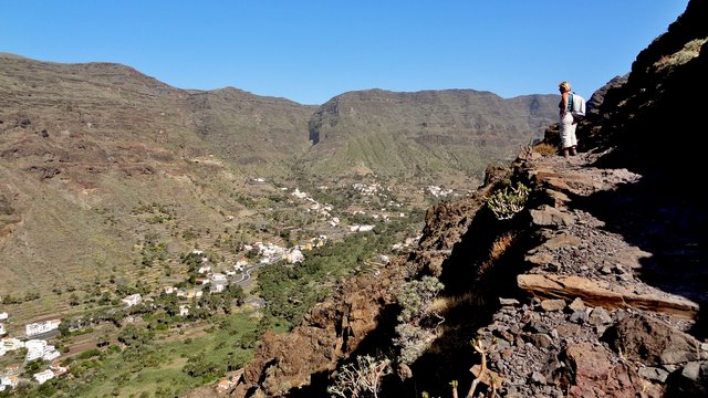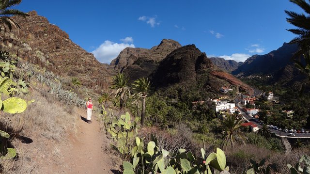 | Auch heute lassen wir es ruhig angehen und genießen die Morgensonne auf unserer Terrasse. Nach einer Einkaufsrunde und kurzer Erfrischung am Pool bringt uns mal wieder der 14:00 Uhr-Bus hinaus aus dem Valle. Dieses Mal steigen wir nach ca. 45 Minuten Fahrt in Las Hayas aus und starten von hier den Rückweg ins Valle Gran Rey. An der Casa Efigenia biegen wir links ab und queren einige aufgegebene Felder und Palmenhaine. Kurze Zeit später stehen wir dann an der westlichen Abbruchkante des Barranco de Valle Gran Rey. Vis a vis liegt El Cercado und die Fortaleza bei Chipude. Wir können unseren Abstiegsweg vom 30.12. gut erkennen während wir auf der gegenüberliegenden Seite über den sog. "Mastenabstieg" hinunter ins Tal steigen. Dieser führt in Serpentinen über einen Sattel hinunter nach Los Descansaderos. Während des gesamten Abstieges liegt das VGR wie in einer Miniatur vor uns. An markanten Punkten wie z.B. dem Mirador de Cesar Manrique erkennt man gut, wie man sich nach unten vorarbeitet. Während man anfangs noch von weit oben darauf schaut hat man einige Zeit später bereits das gleiche Höhenniveau erreicht. Kurz danach sieht man den Aussichtpunkt oben ins der Wand liegen. In Los Descansaderos erreichen wir die kleine Straße welche uns über La Vizcaina, El Hornillo, Chelé und der Ermita de los Reyes (...hier laufen schon die Vorbereitungen zur großen Fiesta am 06. Januar) wieder hinunter ins Tal nach la Puntilla bringt. | ||
