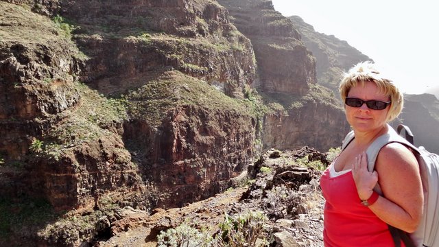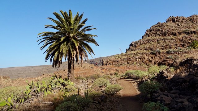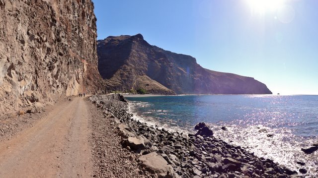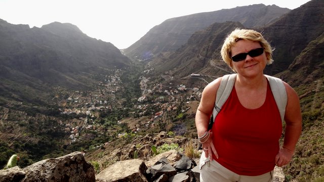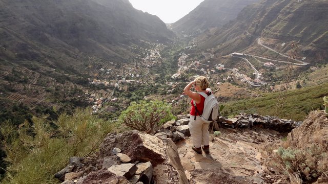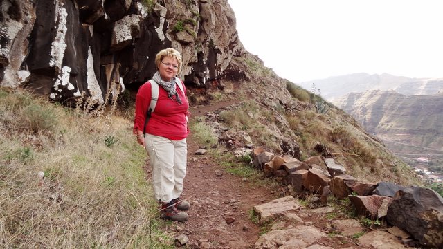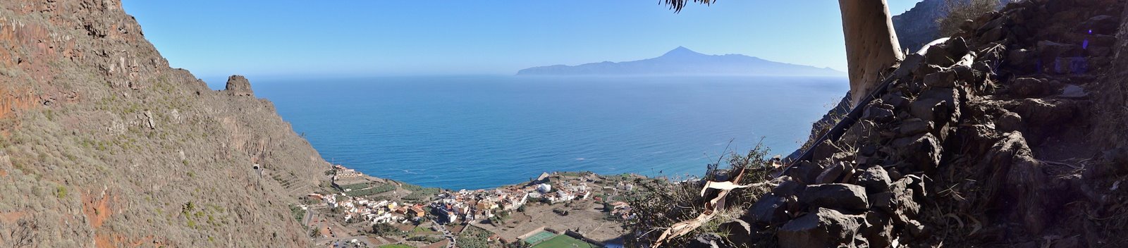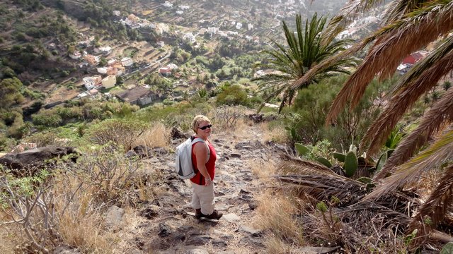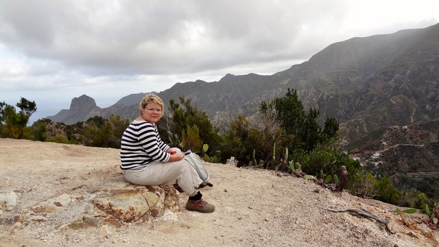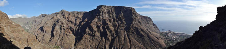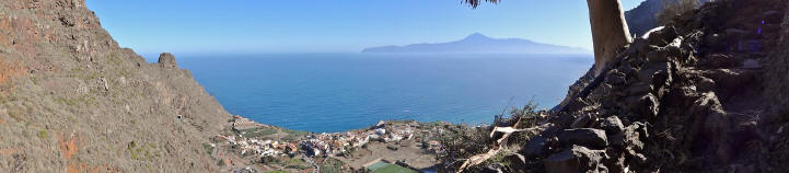 | Nach dem Frühstück und der Lektüre der aktuellen Tagespresse (Dank Internet kann man auch hier die heimatliche Presse lesen und muss nicht auf das Exemplar mit den großen Buchstaben und vielen Bildern zurückgreifen) wechseln wir zuerst einmal an den Pool. Wir genießen die Morgensonne und lassen es uns gut gehen. Dann bringt uns der 14:00 Uhr -Bus hinauf nach Arure, wo wir die Wanderung über La Mérica beginnen. Zuerst haben wir einen schönen Blick ins Tal hinunter nach Taguluche mit seinen vielen Palmen. Ebenso liegt am Rande der Felsen der nach Jahren nun scheinbar fertiggestellte Mirador El Santo nebst gleichnamiger Ermita. Nach kurzen Zwischenaufstieg erreichen wir die Hochebene La Mérica. Von hier oben hat man einen wundervollen Blick hinüber zum Garajonay, der Fortaleza und später erkennen wir auch den Calvario bei Alajero im Süden der Insel. Ziemlich Höhe haltend verläuft der Weg entlang auf dem Hochplateau. Einige Zeit später stehen wir dann vorn an der Kante und unter uns liegt das Valle Gran Rey und gegenüber der Tequergenche. Einige Fotos später beginnen wir dann mit dem Abstieg über die geröllige Piste die ca. 890 Hm hinunter nach La Calera. Dafür benötigen wir ca. 1 Stunde so dass wir pünktlich zum Sonnenuntergang an der Playa bei Maria eintreffen. | ||