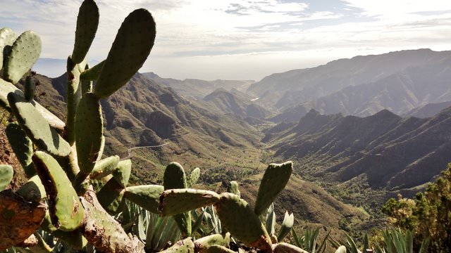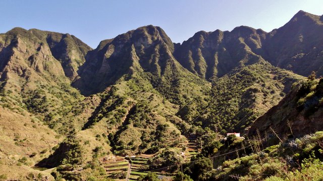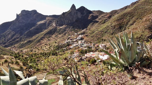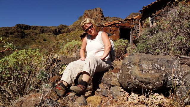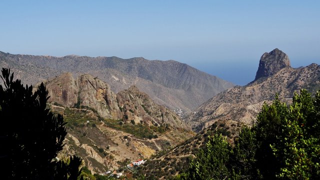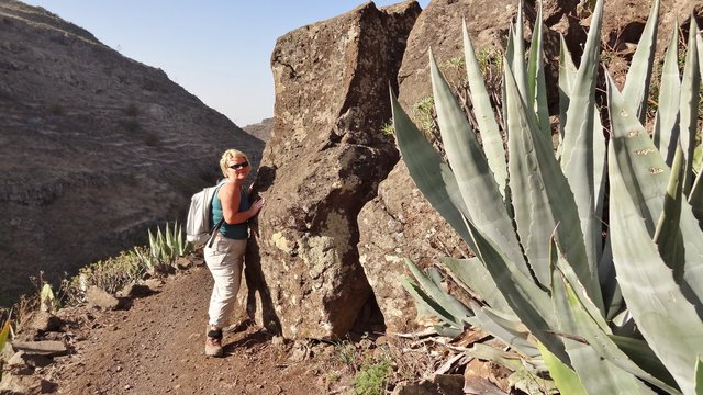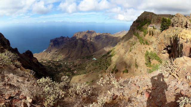 | Das stabile Sonnenwetter setzt sich auch heute fort. Wie immer gibt es das Frühstück auf der Terrasse und auch heute stehen viele frische Maracujas auf dem Tisch. Anschließend fahren wir über die Höhenstraße hinüber nach Imada, wo wir das Auto parken. Wir wollen hier die Rundwanderung um Imada angehen, welche wir bereits im letzten Jahr unternommen haben. Zuerst führt der (kürzlich ausgebaute) Weg steil nach oben. Dort treffen wir auf den Weg der von der Olsen-Hütte herunterkommt und biegen an dieser Stelle hinunter in den Barranco ab. Der Weg führt weiter zu den verfallenen Häusern von El Azadoe, welche auf dem Lomo del Gato (Katzenbuckel) liegen. Dieser trennt den Barranco de Benchijigua vom Barranco de Guarimiar. Von hier oben erkennen wir den Wanderweg durch den Barranco de Guarimiar, welchen wir auch noch planen. Bei El Azadoe gehen wir noch einen kleinen Abstecher nach vorn und haben hier einen wunderbaren Blick hinüber zum Roque Agando. Dann führt der Weg zurück nach Imada wo unser Mietwagen steht. Wie schon in den letzten Tagen fahren wir dann hinunter zur Playa del Medio um den nachmittag am Strand zu verbringen. | ||
