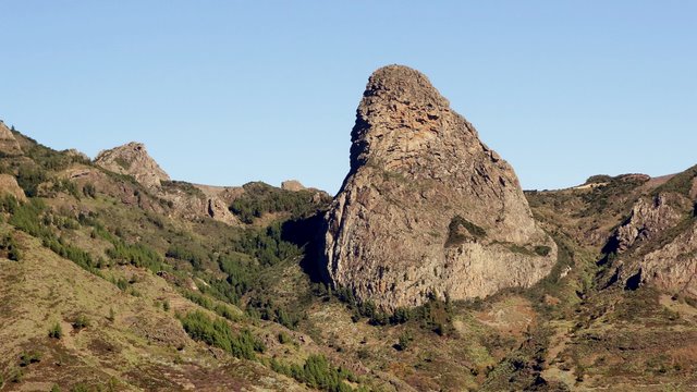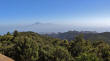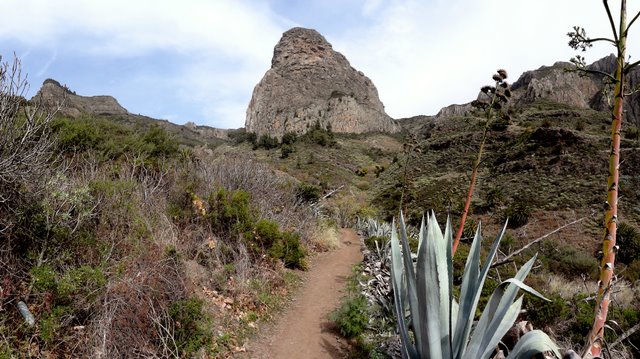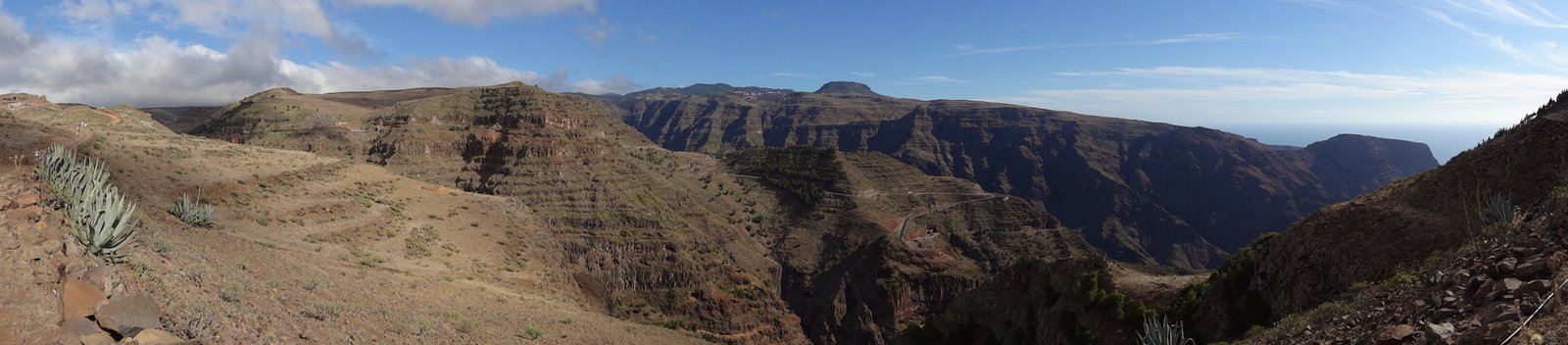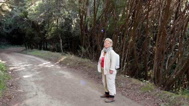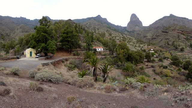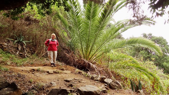 | Heute Morgen ist es ziemlich dunstig. Das liegt am Calima, das sind feine Saharastaubpartikel, welche durch den derzeitigen Südost-Wind aus Afrika herüberwehen. Deshalb heißt der Calima auch Africano. Trotzdem ist es nach wie vor angenehm mild, nur die Sonne schafft es meist nicht durch die staubige Luft. An unserem letzten Tag mit Mietwagen fahren wir wieder hinauf auf die Carretera Dorsal und parken am neuen Kreisverkehr am Pajarito. Hier beginnt unsere heutige Wanderrunde. Die erste Etappe führt uns in Richtung Olsen-Hütte, von wo aus wir eine zuerst breite Forstpiste hinab gehen. Später wird der Weg immer schmaler und am Beginn des steileren Wegstückes beim Abstieg nach Imada ist es nur noch ein Pfad. Nach ca. 1 Stunde erreichen wir die Weggabelung, an welcher wir vor einigen Tagen bei unserer Runde um Imada bereits vorbeigekommen sind. Auf bekannten Weg geht es weiter in Richtung Lomo del Gato nach El Azadoe. Von hier schlagen wir einen für uns neuen Weg ein, den Abstieg in den Barranco de Benchijigua. Nach ziemlich genau einer Stunde nach Überschreitung des Kammes bei Lomo del Gato erreichen wir den kleinen Weiler Benchijigua, wo wir eine kurze Rast machen. Nun geht es wieder nach oben zur Höhenstraße. Der Weg führt durch Agaven und Palmen, später wird er immer steiler und geht zuerst durch Baumheide und kurz vor dem Roque Agando durch imposanten Kiefernwald. Während des gesamten Aufstieges thront der mächtige Roque Agando über uns. Oben angekommen geht es per Anhalter zurück zum Pajarito, wo unser Auto steht. | ||