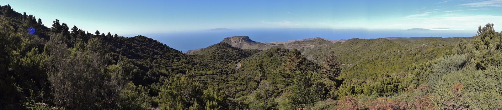 | Nachdem es gestern etwas bewölkter war sind auch heute Morgen noch ein paar Wolken am Himmel. Jedoch sobald wir nach dem Frühstück aus dem Tal hinaus fahren ist kaum noch eine Wolke zu sehen. So entschließen wir uns nach der gestrigen größeren Runde heute nur eine kurze Wanderung hinauf auf die Cumbre Carbonera bei Hermigua zu unternehmen. Über die Carretera Dorsal (Höhenstraße) fahren wir durch den El Cedro hinüber in Richtung Hermigua auf die Nordseite La Gomeras. Kurz vor dem Tunnel der Carretera del Norte parken wir und steigen in ca. 45 Minuten steil nach oben auf die Cumbre. Der Weg windet sich in Serpentinen hinauf durch Lorbeer- und Baumheidewald. Oben angekommen bietet sich ein grandioser Blick Richtung San Sebastian. Auch einen Teil von Teneriffa können wir gut ausmachen auch wenn sich der Teide hinter Felsen versteckt. Nach einer kurzen Rast geht es auf gleichem Weg wieder zurück. Dann fahren wir via Degollada de Peraza hinunter nach Playa Santiago wo wir den Nachmittag bei herrlicher Sonne und besten Badebedingungen (ca. 20°C Wassertemperatur) verbringen. Dann geht's wieder ins Valle zurück wo wir wie so oft in den letzten Tagen den Sonnenuntergang an der Playa erleben. | ||