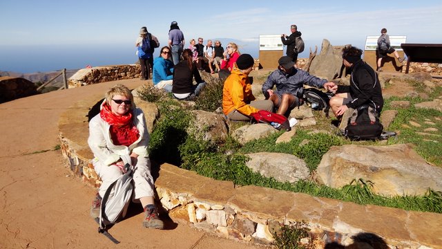 | Der Sonntag ist heute wirklich ein "Sonnentag". Bei herrlichen wolkenlosen Himmel genießen wir das Frühstück. Anschließend fahren wir dann hinauf zur Höhenstraße und weiter nach Chipude. Nach dem kleinen Ort biegen wir in die Straße nach Erque ein und parken nach ca. 300 Metern unser Auto. Hier beginnen wir unsere heutige Wanderung zur Fortaleza. Genau vor einem Jahr waren wir auch hier und haben den markanten Tafelberg erklommen. Nach ca. 15 Minuten stehen wir am Fuß der Fortaleza und erreichen kurze Zeit später den Einstieg zur kurzen Kletterpartie. Auch wenn der Aufstieg im Vergleich zu früheren Jahren inzwischen deutlich entschärft ist sollte man jedoch schwindelfrei sein. Während des Aufstieges muss man an vielen Stellen die Hände zu Hilfe nehmen und sich schon konzentrieren, denn an vielen Stellen geht es um einiges nach unten. Nach dem ersten Kletterstück folgt dann oben noch eine Kraxelpassage und dann stehen wir oben auf dem Plateau der Fortaleza. Am Horizont erkennen wir die Nachbarinseln El Hierro und La Palma und haben ein phantastisches Panorama über La Gomera. Wir genießen die Stille und die Weite des Augenblicks und lassen die Gedanken treiben. Wer hoch hinauf aufsteigt muss natürlich auch wieder nach unten. So machen wir uns auf dem gleichen Weg wieder auf, um nach unten zu gelangen. Wieder am Auto zurück fahren wir via Alajero hinunter nach Playa Santiago an die Playa del Medio, wo wir den Nachmittag in der Sonne verbringen und die Gelegenheit zu einem erfrischendem Bad im Atlantik nutzen. Dann fahren wir ins Valle Gran Rey zurück und platzieren uns an der Playa um heute einen besonders farbenprächtigen Sonnenuntergang zu erleben. Zum Tagesausklang geht's dann noch ins Abisinia. | ||