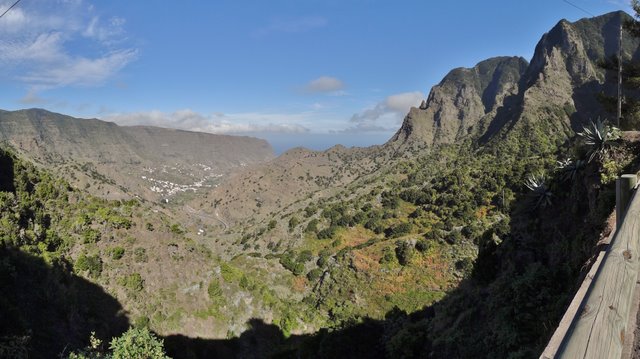 | Heute Morgen strahlt die Sonne vom fast wolkenlosen Himmel. So haben wir allerbeste Bedingungen für unser Terrassenfrühstück. Anschließend bummeln wir gemütlich Richtung Hafen von Vueltas. Hier trifft gerade die Fähre Benchi-Express aus San Sebastian ein. Durch die engen Gassen von Vueltas geht es zurück ins Baja del Secreto, wo wir nochmal kurz in den (ziemlich frischen) Pool springen. Dann brechen wir zur Bushaltestelle auf um mit dem Servicio Regular hinauf nach El Cercado zu fahren. Nach einer knappen Stunde Fahrt kommen wir dort oben an. Inzwischen sind auch einige Wolken aufgezogen, so dass wir die Jacke überziehen müssen. Auf steilem Pfad führt der Weg im oberen Barranco de Valle Gran Rey entlang. Das Valle liegt tief unter uns und wir gehen auf einem exponierten aber jederzeit gut begehbaren Camino in vielen Serpentinen hinunter nach La Vizcaina. Via El Hornillo und Chele gehen wir entlang der östlichen Barrancoseite bis zur Ermita de los Reyes, wo schon erste Vorbereitungen für die Fiesta am 06.01. getroffen werden. Pünktlich zum Sonnenuntergang erreichen wir dann die Playa, wo wir den Tag beim Sonnenuntergang ausklingen lassen. | ||