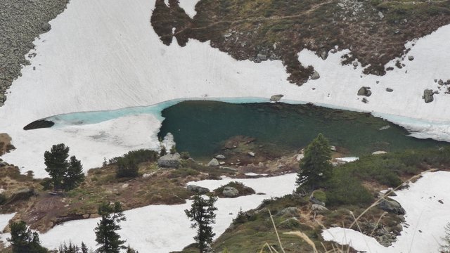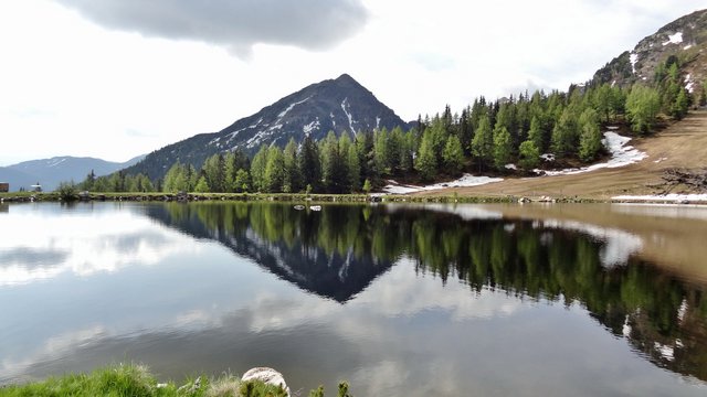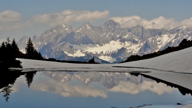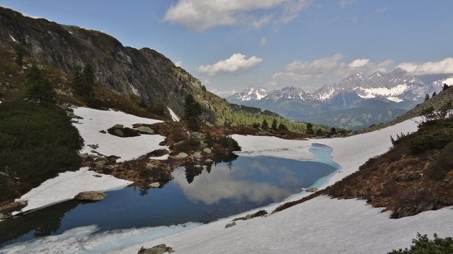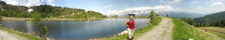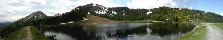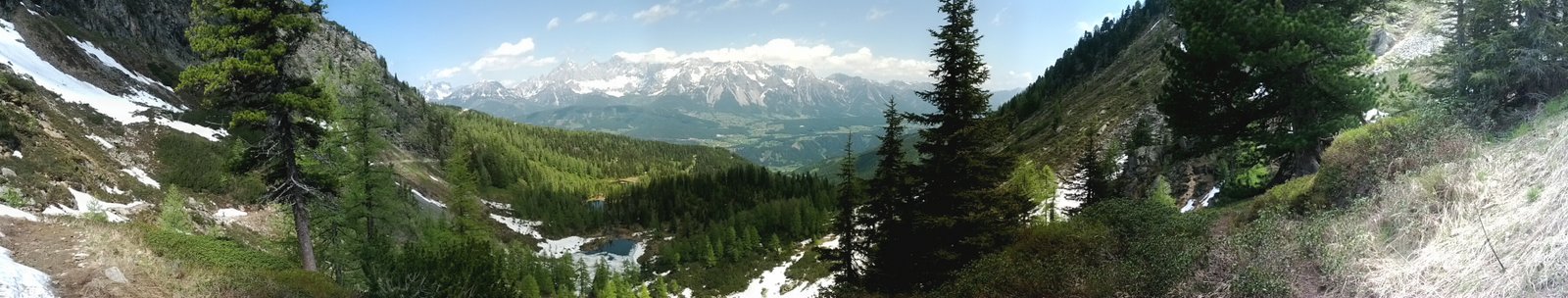 | Obwohl der Wetterbericht bereits für heute kein optimales Wetter vermeldet hat werden wir doch von Sonnenschein geweckt und erleben von unserem Balkon einem traumhaften Dachsteinblick. Nach einer Runde im Schwimmbad und dem Frühstück starten wir recht früh über die Ennstalstraße hinauf zur Reiteralm. Die Maut ist in unserer Sommercard enthalten und so erreichen wir die Reiteralm über eine staubige aber gut befahrbare Piste. Ein Wanderer war noch vor uns da und so haben kein Problem mit der Parkplatzsuche. Vorbei am Reiteralmsee steigen wir steil zur Gasselhöhe auf und genießen ein wunderbares Panorama hinüber zum Dachstein. Weiter geht es auf einem Kamm hinüber zum Rippetegg. Hier queren wir immer wieder Schneefelder auf welchen man teilweise schlecht vorankommt. Kurz unterhalb des Gipfels zweigt ein steiler Pfad nach unten in Richtung Gasselseen ab. Der eigentliche Weg ist noch von Schneefeldern verdeckt und so haben wir am Gipfelkamm einen schwierigen Einstieg in unseren Abstiegsweg. In engen Serpentinen und immer wieder über Schneefelder und etwas Kraxelei steigen wir hinunter zu den Gasselseen. Der Obere Gasselsee ist fast noch völlig zugefroren. Dann sehen wir schon den Mittelsee, auch Spiegelsee genannt. Wie man am Namen schon erkennen kann hat man hier eine tolle Spiegelung des gegenüber liegenden Dachsteinmassivs. Dann geht es wieder zurück zur Reiteralm. Wir fahren wieder die Piste hinunter und via Rohrmoos fahren wir nach Schladming. Hier wird im ganzen Ort gebaut und man sieht allerorts, dass man sich auf die Ski-WM 2013, welche hier ausgetragen wird, vorbereitet. Wir nehmen die Planai-Bergbahn und fahren mit der Gondel hinauf auf die Planai. Hier oben wandern wir entlang des Panoramaweges, welcher sich rund um den Planaigipfel schlängelt. Nach der Gipfelrunde fahren wir wieder hinunter nach Schladming und fahren zurück ins Hotel Martin. Hier lassen wir es uns in der Sauna gutgehen. Gegen Abend wird es zuerst noch einmal richtig sonnig während nach dem Sonnenuntergang dann einige dickere Wolken aufziehen. Hoffen wir mal, dass morgen wieder Wanderwetter ist. | |||