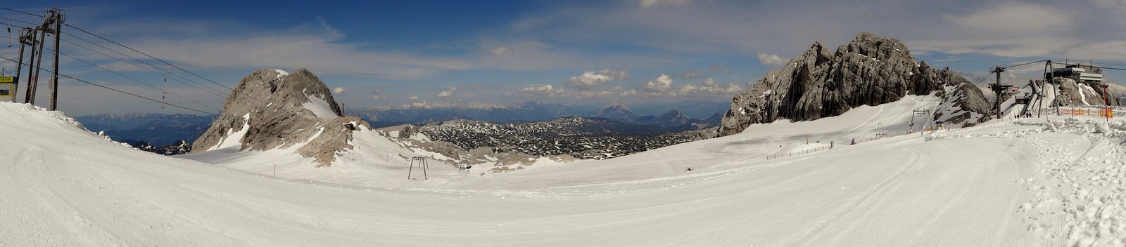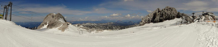 | Gegen 08:00 Uhr starten wir von zu Hause in Richtung Süden. Leider hatten wir bei unserer Terminplanung nicht bedacht, dass in einigen Bundesländern heute Feiertag (Fronleichnam) ist, was sich natürlich bei der Verkehrslage rund um München bemerkbar macht. Nach einigem Stau erreichen wir dann via A8, Salzburg und die Tauernautobahn dann das Ennstal und unser Quartier, das Hotel Martin in Ramsau. Schnell haben wir eingecheckt und 30 Minuten später sind wir bereits wieder on Tour. Da heute herrliches Sonnenwetter und für die nächsten Tage die Vorhersage eher ungünstig ist entschließen wir uns spontan gleich heute Nachmittag zur Tour auf den Dachsteingletscher. Nach kurzer Fahrt zur Talstation der Bergbahn müssen wir nicht anstehen sondern nehmen sofort die nächste Gondel und fahren auf fast 3000 Meter Höhe hinauf. Oben angekommen stehen wir mitten im Schnee und haben ein tolles Panorama bis hinüber zum Großglockner und Großvenediger. Am Nachmittag ist auch die Dachsteinsüdwand besonders schön angestrahlt und so drehen wir eine kurze Runde durch den Schnee bei Sonnenschein, stahlblauen Himmel und Windstille. Mit der vorletzten Gondel schweben wir dann wieder nach unten. Da uns nach der langen Anfahrt noch nach einer kurzen Wanderung ist machen wir noch eine Kurzwanderung hinauf zur Südwandhütte. Der Weg führt unter der Seilbahn durch Schneefelder hinüber zur Hütte. Zurück am Auto fahren wir retour zum Hotel Martin, wo wir gut zu Abend essen. | |||