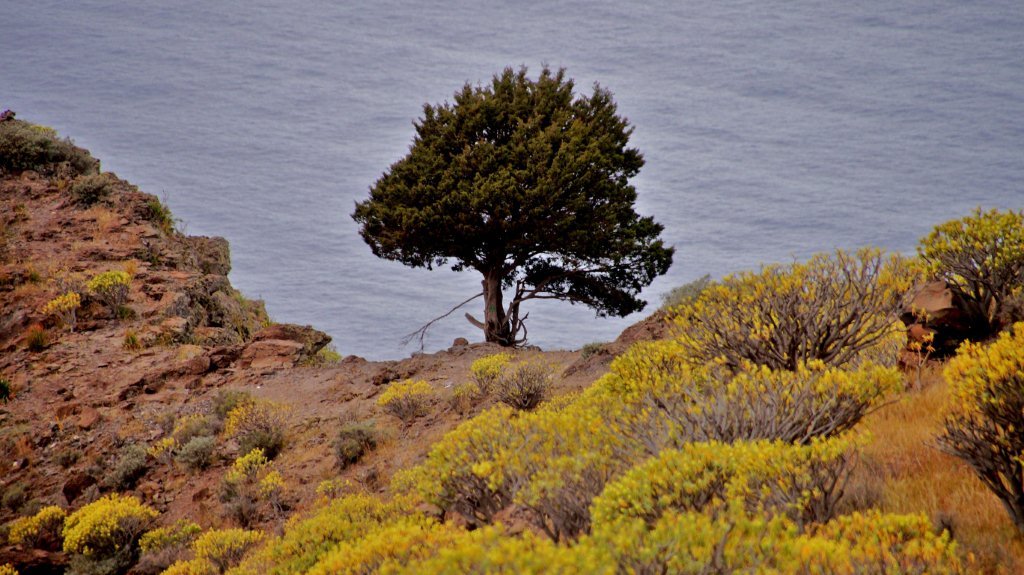 | Nach dem sonnigen Terrassenfrühstück bummeln wir heute Vormittag durchs Valle. Dabei scheint die Sonne vom fast wolkenlosen Himmel. Während Ines die Relaxvariante auf Terrassien wählt entscheide ich mich für den 13:00 Uhr-Bus, welcher mich hinauf nach Arure bringt. Hier oben ist es wie immer deutlich kühler als unten im Tal (pro 100 Höhenmeter ca. 1°C weniger) und so sind es hier oben nur noch ca. 10°C. Am Restaurant "El Jape" beginnt die Wanderung. Vorbei am Mirador del Santo führt der Weg zur Hochebene von La Mérica. Am Beginn hat man eine tolle Panoramasicht hinunter ins Palmental von Taguluche und den Galiónbergen. Auf der anderen Seite bietet sich das tolle Panorama ins Valle Gran Rey. Leider ist inzwischen die Sonne hinter den Wolken verschwinden und so hüllt sich auch die Fortaleza bei Chipude und der Garajonay in dicke Wolken. Der weitere Weg führt entlang des Plateaus bis man am vorderen Rand das untere Valle Gran Rey erkennen kann. Vor dem Abstieg mache ich noch einen kurzen Abstecher zu einem markanten Sabinosa-Baum, welchen man auch aus dem Tal mit bloßen Auge erkennen kann. Von hier oben hat man einen genialen Panoramablick und auch wenn wir schon viele Male hier oben gewesen sind so ist man immer wieder begeistert von der tollen Aussicht auf das Valle. Dann geht es in vielen Serpentinen hinunter ins Tal. Am Abend besuchen wir dann mal wieder das "Abisinia" und erleben anschließend am Charco del Conde einen schönen Sonnenuntergang. | ||||