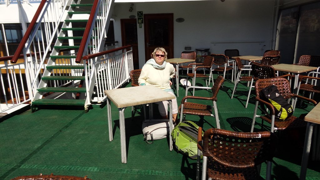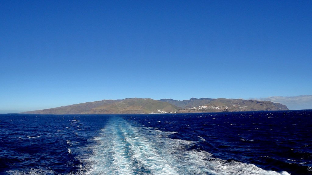 einen Platz auf dem Außendeck gefunden und sehen zuerst, wie La Gomera immer