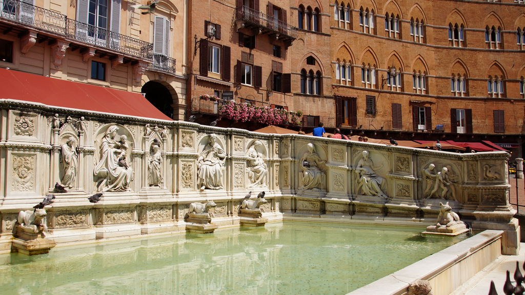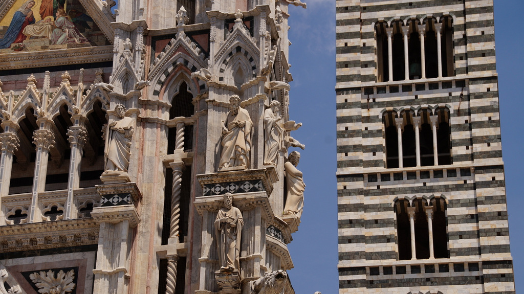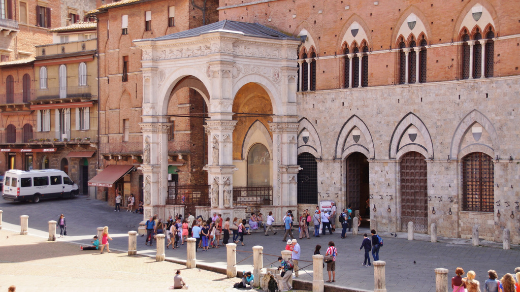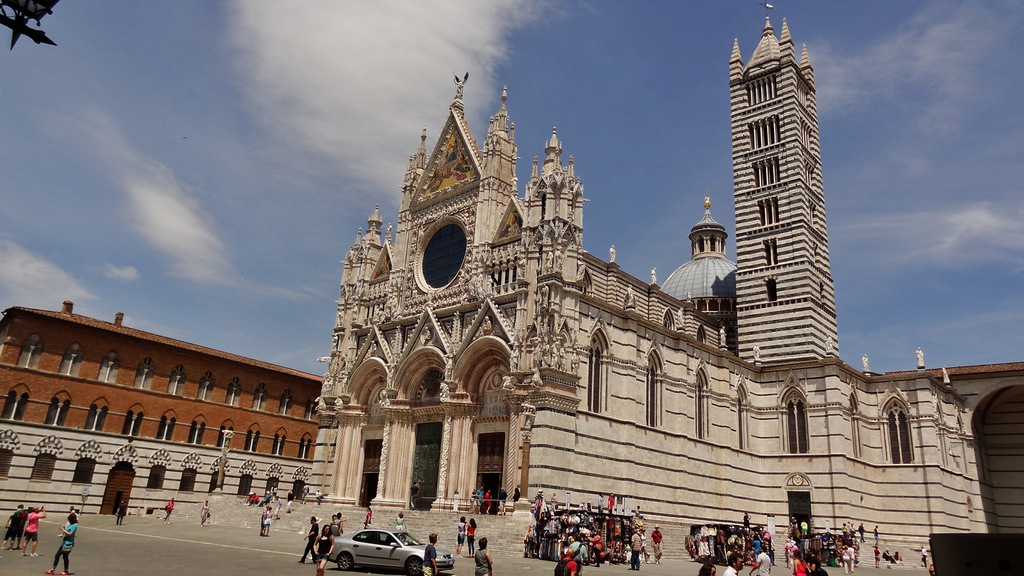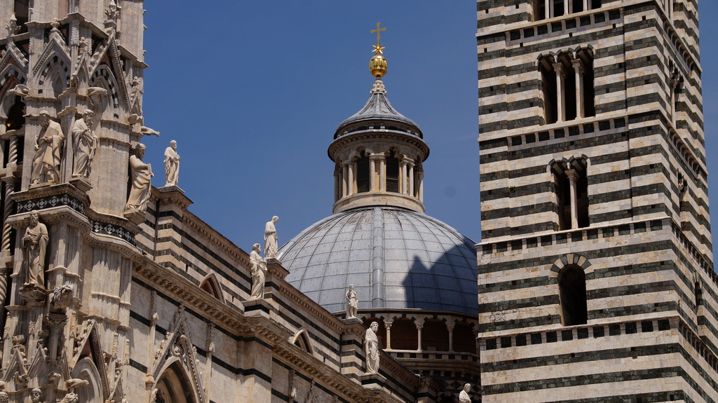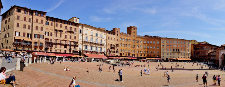 | Heute steht der Besuch von Siena auf unserem Programm. Auf unserer "Standardstrecke" fahren wir via San Gimignano und Poggibonsi zur Autostrada Firenze-Siena. Die Strecke wird derzeit streckenweise saniert, was auch sehr notwendig ist, da viele Schlaglöcher und Bodenwellen auf der Strecke zu finden sind. Ebenso sind in dieser Gegend der Toskana eine Vielzahl von "Autovelox" installiert, graue Blitzerkästen, welche von hinten blitzen. Hoffentlich erreicht uns nach unserer Rückkehr keine spezielle Post aus Italien. Nach einer reichlichen Stunde erreichen wir Siena, wo wir wie immer im Parkhaus Fontebranda parken. Über Rolltreppen erreichen wir in wenigen Minuten das Centro Storico. Nach ein paar Schritten stehen wir dann auf dem großen Platz inmitten von Siena - Il Campo. Dieser Platz ist einfach nur beeindruckend und wir setzen uns, wie viele andere Besucher, einfach mitten auf den Platz und genießen die Szenerie. Weiter führt der Weg durch die engen Gassen der Innenstadt, vorbei an einer Vielzahl von schicken Geschäften bis wir den Platz vor dem Dom erreichen. Das Portal ist sehr aufwändig und filigran und komplett mit Marmor verkleidet. Der Campanile ist mit schwarzen und weißen Marmor verziert. Nachdem wir den Anblick ausgiebig genossen haben gehen wir zum Parkhaus zurück. Auf der gleichen Strecke fahren wir retour, biegen dann aber noch nach Montaione ab, wo wir ein paar Einkäufe erledigen. Den letzten Teil des Nachmittages verbringen wir dann bei besten Sonnenwetter am Pool der Casa Vaiano. | |||