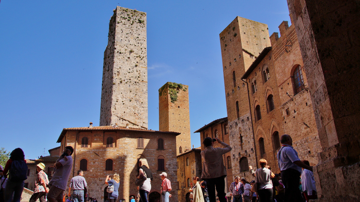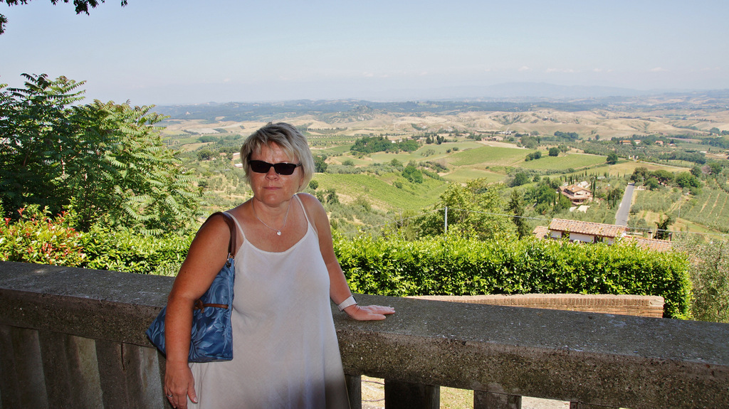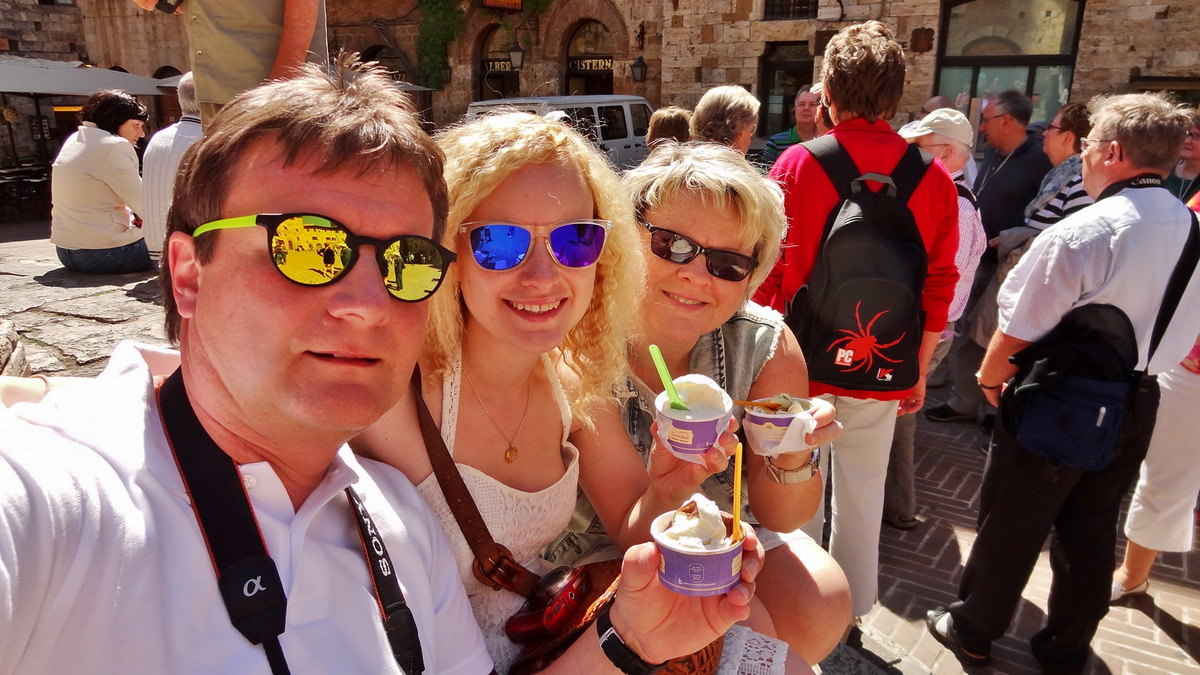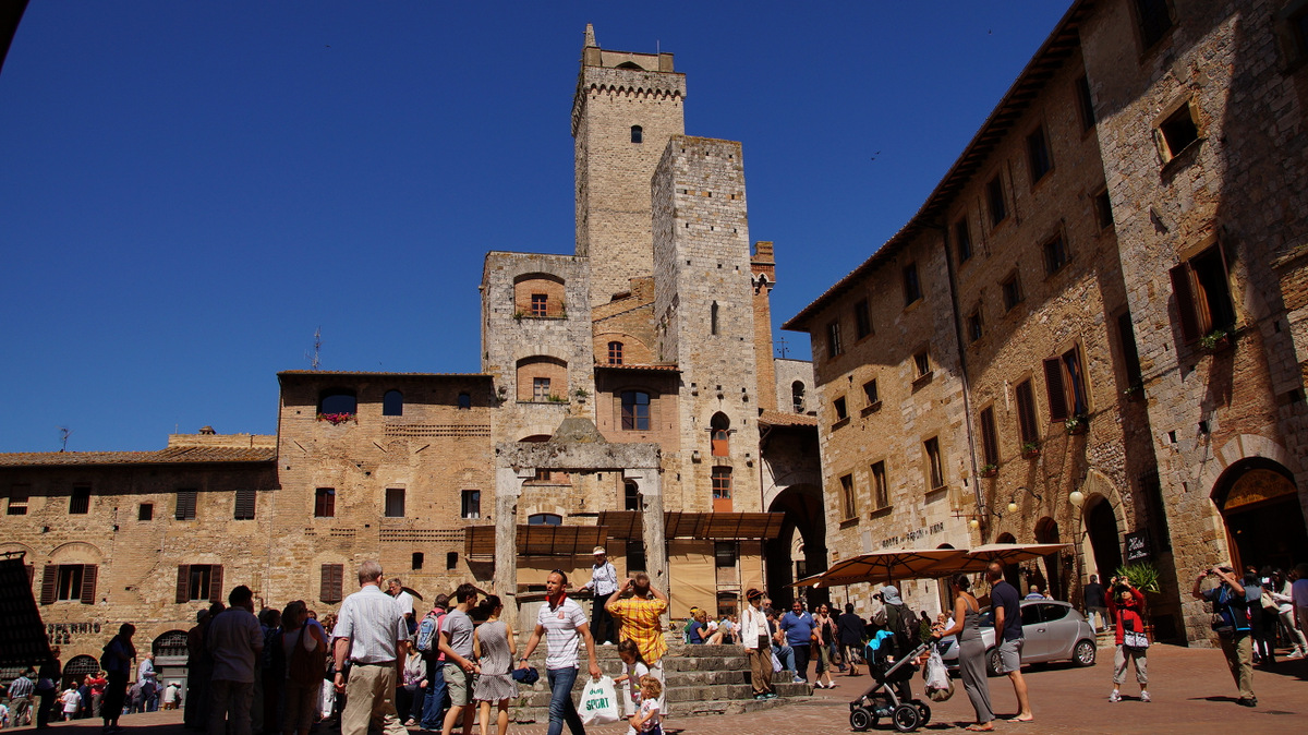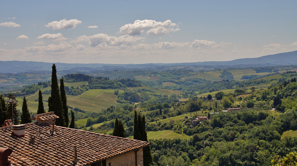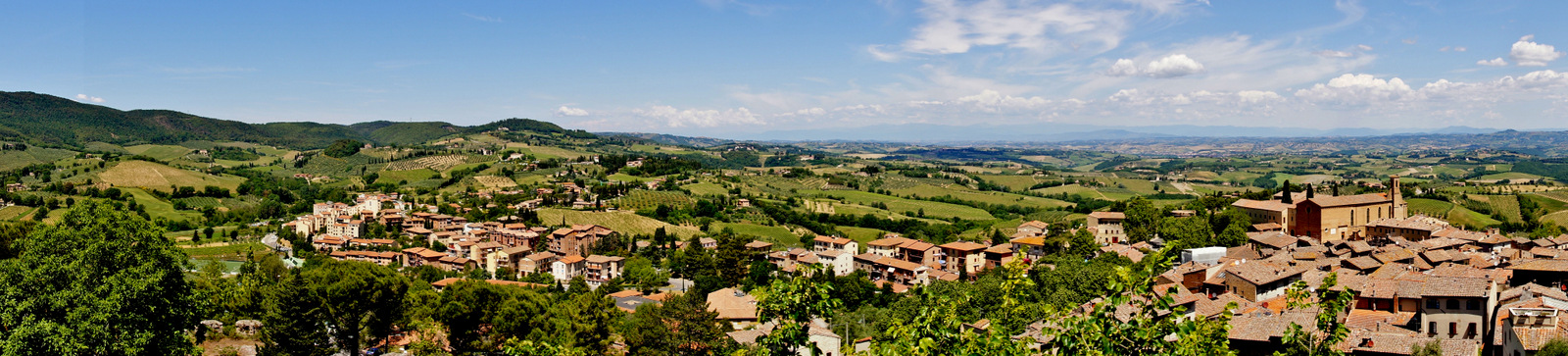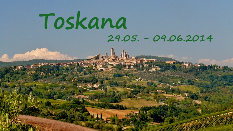 | Heute Morgen lacht die Sonne vom blauen Himmel. Somit zieht es uns zum Frühstück unweigerlich auf unsere Terrasse. Nach dem Frühstück starten wir gegen 09:00 Uhr in Richtung San Gimignano. Dahin haben wir es nicht allzu weit, so dass wir einen der Top-Hotspots der Toskana bereits nach ca. 20 Minuten erreichen. Zu dieser frühen Stunde ergattern wir auch gleich einen der wenigen Parkplätze und schlendern in den Ort. Der Ort, auch als Manhattan der Toskana bezeichnet, hat noch mehrere der alten Türme, welche man weithin sehen kann. Neben vielen alten Fassaden gibt es hier eine Vielzahl von touristischen Geschäften. Auch wenn hier viele Touristen zu Gange sind so gehört ein Besuch in dem kleinen Ort zum Pflichtprogramm eines jeden Toskanaaufenthalts. An der Piazza im Ortskern verkosten wir bei Dondoli noch ein leckeres Gelati (lt. Eigenwerbung mehrfacher Weltmeister der Eishersteller). Vom Punto Panoramico hat man einen weiten Blick über die hügelige Landschaft der Toskana. Nach dem Mittag geht es dann zurück in die Casa Vaiano, wo wir den Nachmittag bei wunderbaren Sonnenschein am Pool verbringen und einfach die Seele baumeln lassen. | |||