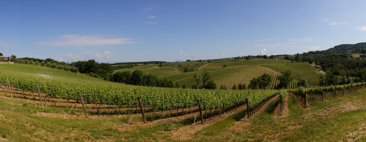 | Heute Morgen fahren wir nach einem ausgiebigen Frühstück via San Gimignano und Poggibonsi zur Autostrada in Richtung Firenze. Bei Tavernelle biegen wir nach ein paar Kilometern schon wieder ab und fahren entlang von engen Straßen durch die Weinberge des Chianti. Bei Passo dei Pecorei biegen wir in eine Zypressenallee zum Castello di Gabbiano ein. In der alten Festung befindet sich (wie in den meisten alten Gemäuern hier) ein Weingut. Nach einer kurzen Verkostung erstehen wir ein paar Flaschen des lokalen Weines. Dann fahren wir weiter nach Greve, dem Hauptort im Chiantigebiet. Neben dem schönen Ort ist vor allem die Antica Macelleria Falorni, der Kultfleischer der Region, unser Ziel. Einige der leckeren Salami (Cinghiale und Tartufo) verstauen wir in unserer Kühlbox. Kurz hinter Greve biegen wir in eine enge Straße ein, welche uns durch Weinberge hinaufführt und erreichen so die Villa Vignamaggio. Angeblich soll Leonardo da Vinci hier die berühmte Mona Lisa gemalt haben. Wir haben uns hingegen auf das Verkosten der Weine des hiesigen Weingutes konzentriert. Auch von hier gehen ein paar Flaschen mit auf die Heimreise. Von hier fahren wir weiter in den Nachbarort Panzano. Wir parken an der Hauptstraße und schlendern hinüber zum Centro Storico. Nach unserem Bummel fahren wir dann in Richtung Radda. Wir biegen auch hier wieder in eine kleine Nebenstraße ein und besuchen die Badia a Coltibuono. Via Gaiole und Castellina fahren wir weiter in Richtung Siena und halten als nächstes in Fonterutoli. In dem kleinen Weiler gibt es auch eine erstklassige Enoteca. Neben einem Chianti Classico erstehen wir hier auch eine Flasche guten Olivenöls. Von hier aus fahren wir dann über Badesse nach Poggibonsi, wo wir noch ein paar leckere Sachen zum Abendessen einkaufen. Bei herrlichem Sonnenschein klingt unser Tag auf der Terrasse in der Casa Vaiano aus. | |||