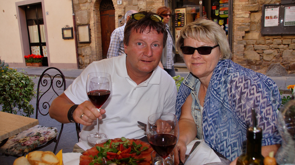 | Nach dem Frühstück fahren wir heute via Poggibonsi und Siena in Richtung südliche Toskana. Nach fast zwei Stunden Fahrt erreichen wir Pienza, die Stadt des Peccorino. Da heute in Italien Feiertag ist sind in der Stadt viele Besucher unterwegs. Neben den vielen alten Bauten begeistern uns hier vor allem die vielen Feinkostgeschäfte, wo es leckeren Käse, Salami und natürlich Wein und Olivenöl gibt. Pienza liegt auf einem Hügel und so können wir vom Rande des Ortes einen weiten Blick über die Hügellandschaft der Toskana genießen. Dann fahren wir wieder retour und machen in San Quirico d' Orcia den nächsten Zwischenstopp. Dieser Ort ist zwar nicht so bekannt wie andere Orte in der Toskana doch auch hier finden wir eine tolle Atmosphäre vor. Wir bummeln durch den ruhigen Ort und besuchen eine Fattoria, wo wir leckeren Rotwein und Olivenöl erstehen. Dann fahren wir ein paar Kilometer weiter in die Stadt des Brunello - nach Montalcino. Schnell finden wir am Ortsrand zu Fuße des alten Castello einen Parkplatz und schlendern durch die alten Gassen des auf einem Hügel gelegenen Weinortes. Hier steht alles im Zeichen des berühmtesten Weins der Toskana - dem Brunello de Montalcino. In den Weinhandlungen kann man beginnend ab ca. 15,- EUR bis weit in den vierstelligen Bereich (...pro Flasche!!) so ziemlich sämtliche Preislagen erstehen. Nachdem wir eine Runde durch den Ort gedreht haben machen wir in der Enoteca "Bacchus" einen Stopp und essen hier leckeres Carpacchio vom Wildschwein und vom Fasan. Das Olivenöl mit Zitrone und die Mandelsplitter runden das Geschmackserlebnis ab. Dazu gibt es natürlich einen lokalen Rotwein. Dann geht es wieder zurück via San Gimignano in unsere Casa Vaiano. | |||