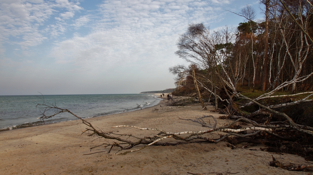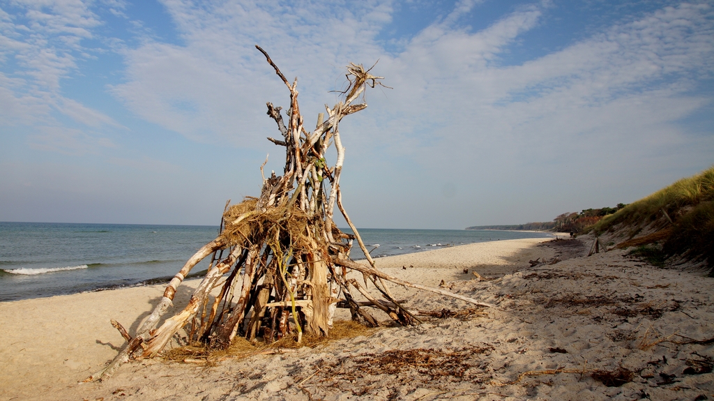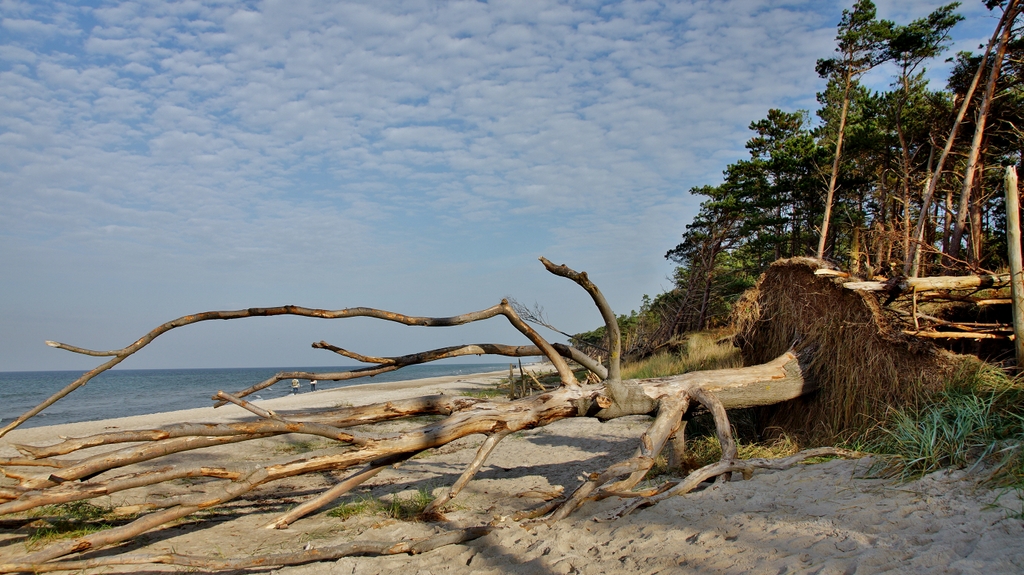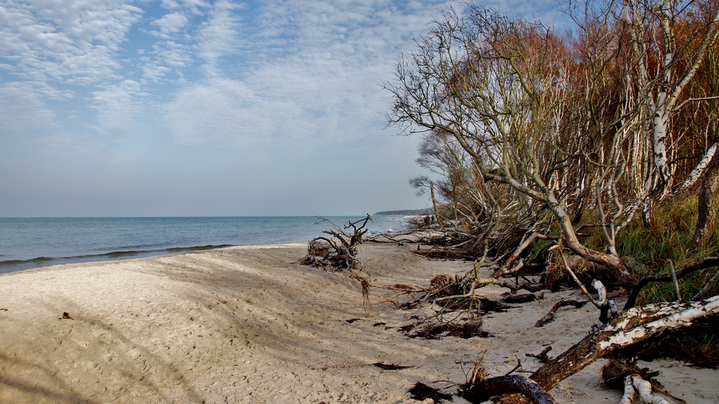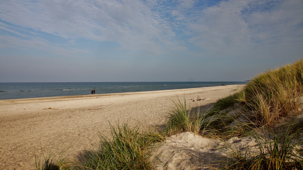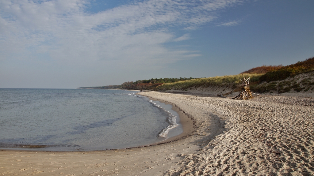 | Leider ist unser verlängertes Wochenende fast schon wieder vorüber. Nach dem wiederum sehr reichhaltigen Frühstück in unserem Hotel packen wir unsere Sachen und fahren ein kurzes Stück zum Parkplatz "Drei Eichen". Von hier aus starten mehrere Wege durch den Dünenwald bis nach Prerow und dem Darsser Ort. Wir biegen gleich den ersten Weg in Richtung Weststrand ab welchen wir nach ca. 10 Minuten erreichen. Den Vormittag bummeln wir dann hier en diesem völlig unverbauten naturbelassenen Strand entlang. Das Wetter meint es heute wieder ausgesprochen gut mit uns und bei Sonnenwetter springe ich nochmals in das ca. 11°C warme Wasser. Dann ist es allerdings Zeit für den Rückweg und wir treten (leider) wieder die Rückreise an. | ||||