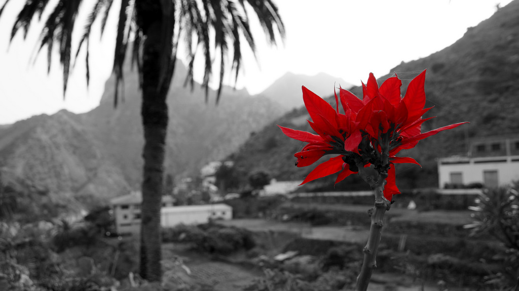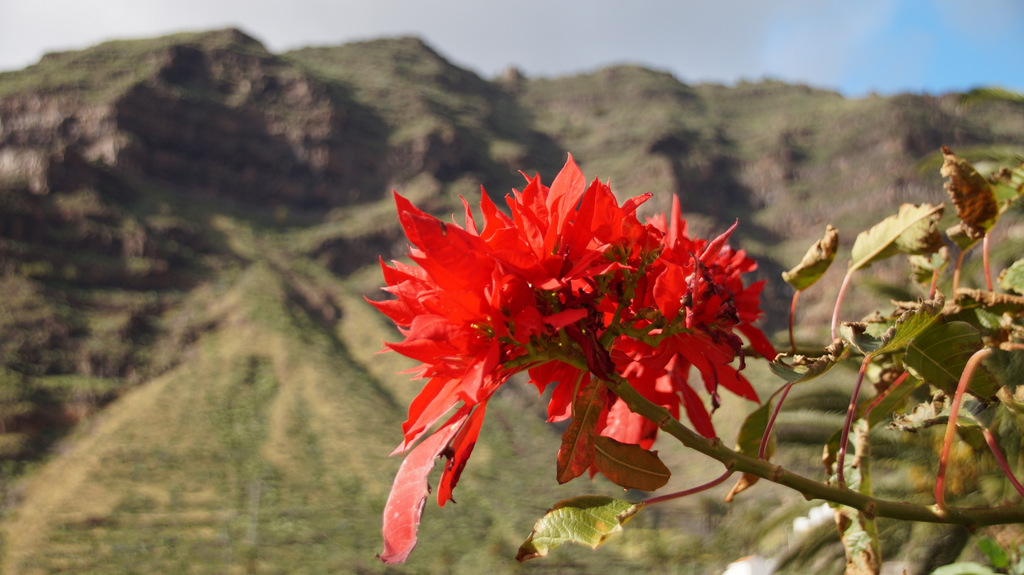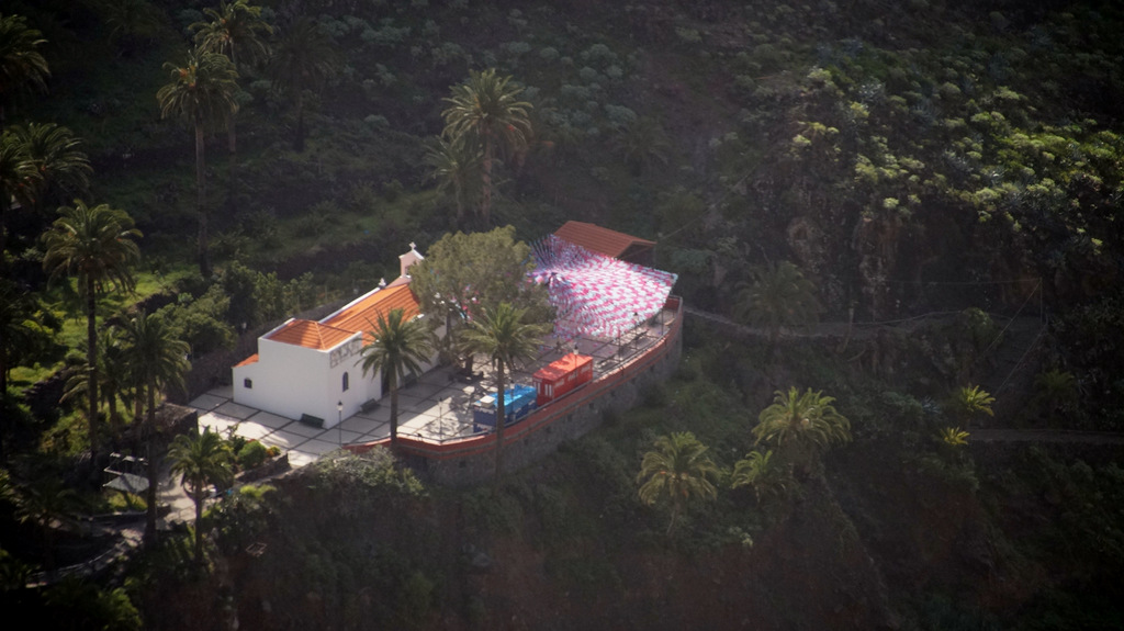 | Natürlich beginnt auch der heutige Tag mit einem ausgiebigen Terrassenfrühstück bei bestem Sonnenwetter. Während wir die warmen Sonnenstrahlen genießen sind aus dem oberen Tal bereits die ersten Böllerschüsse zu hören, denn heute ist Los Reyes. Da sich gegenüber von El Guro die kleine gleichnamige Kapelle befindet wird zu dieser kleinen Kirche hier heute eine große Prozession stattfinden. Dazu wird schon ab dem Vormittag der sog. Ramo, eine Figur aus diversen Früchten erstellt, welche dann unter Kastagnettenklang die Straße hinauf zur Ermita getragen wird. Wir fahren noch vor der Prozession wieder per Autostop hinauf nach El Guro und starten hier zu einer der klassischen Wanderungen im Tal, dem Weg zum Salto del Agua. Nach dem großen Feuer im Jahr 2012 hat sich in El Guro wieder einiges getan und viele zerstörte Häuser sind wieder aufgebaut worden. Dennoch hat sich dieser Ortsteil seinen alternativen Charme erhalten. Durch dichtes Gestrüpp und nach einigen Klettereinlagen erreichen wir den kleinen Wasserfall und machen uns nach einer kleinen Pause wieder auf der selben Strecke auf den Rückweg. Zurück im Baja del Secreto erfrischen wir uns im Pool und verbringen den Nachmittag auf unserer Terrasse. Am Abend schlendern wir dann nochmal nach La Playa wo wir den Sonnenuntergang erleben der auch heute wieder mit Trommeln und einigen Feuershow-Darbietungen zelebriert wird. |